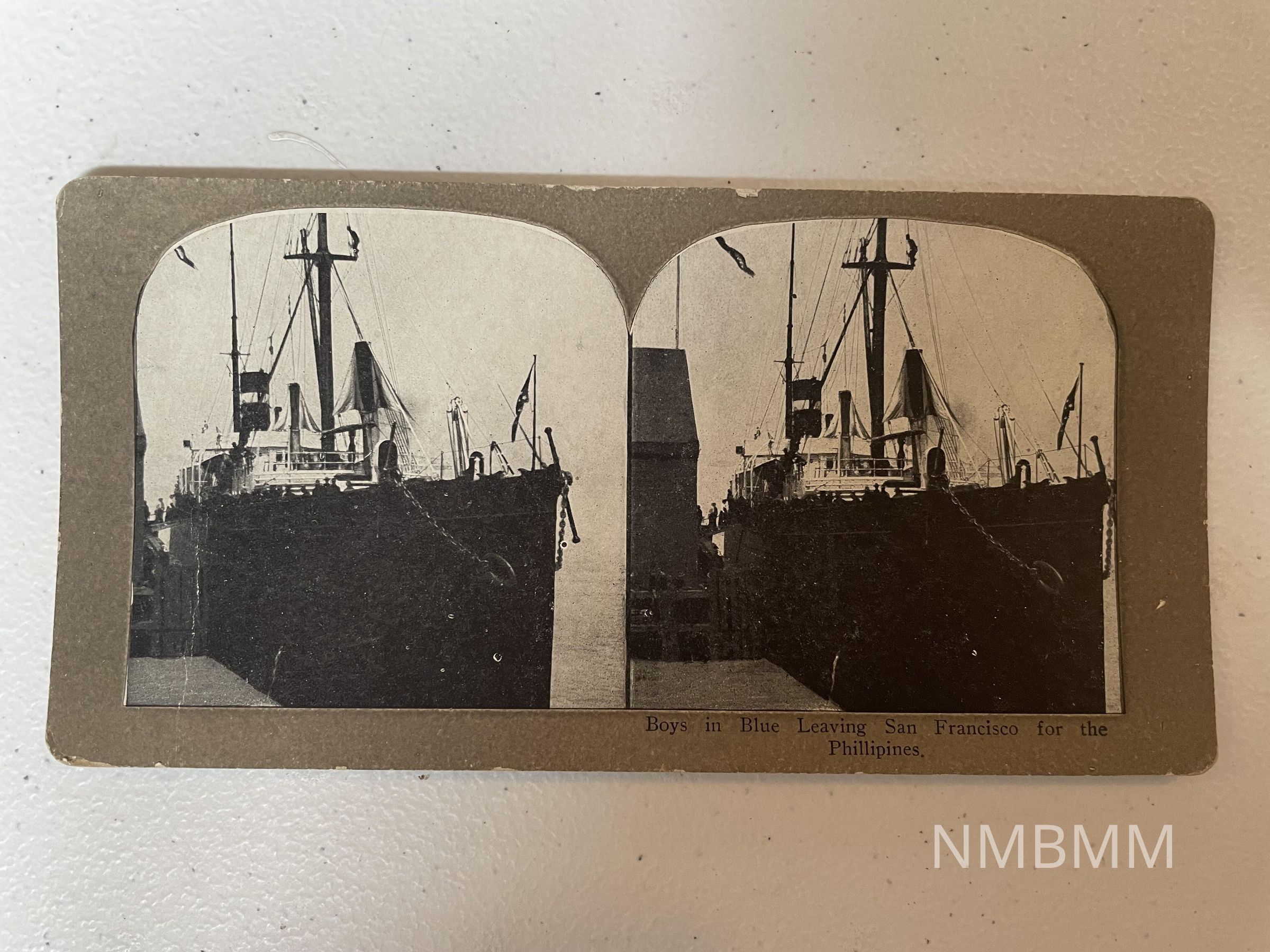 This item is a stereograph containing two images of a ship leaving San Francisco, carrying soldiers, and heading to the Philipines.Collection