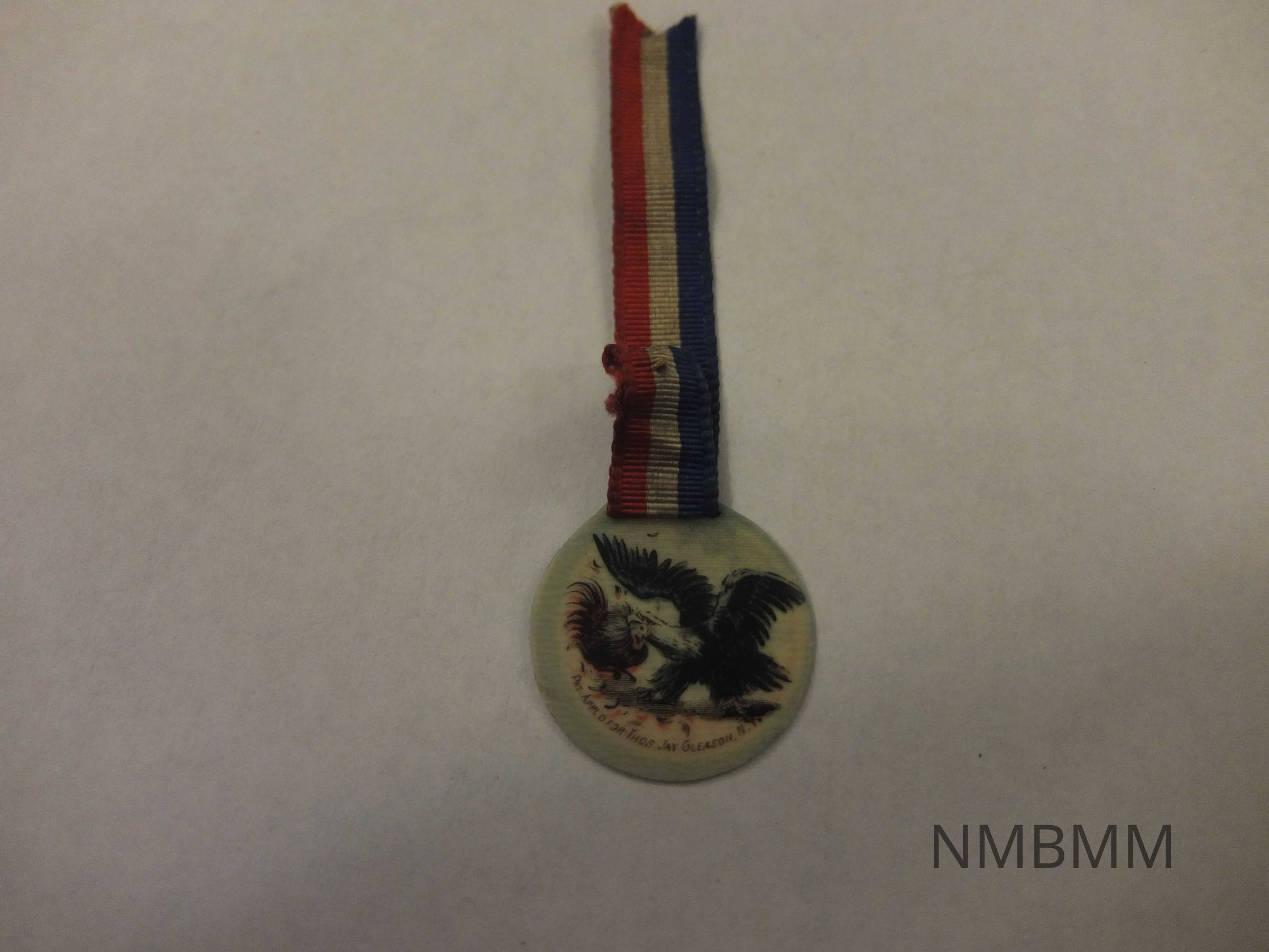This item is a red, white, and blue political ribbon from the 1896 election. Attached to the ribbon is a round circle of paper with the text, "McKinley & Hobart Protection for American Homes Industries Labor Dollars 1896 Hamilton Co. O" on one side. On the other side it says, "Pat. Appl'd for Thos. Jay Gleason. N.Y." with a picture ot two birds.