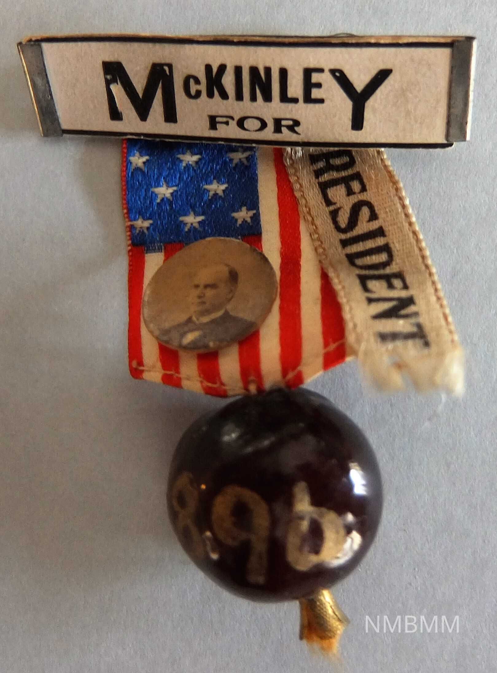 This item is a campaign pin for William McKinley. The pin features a paper banner with a metal backing that says, "McKinley For." Attached to the paper banner is an American flag with a small black and white circle photo of McKinley and a piece of white satin with the word, "President." Attached to the bottom of the flag is a small buckeye with a tassle. 4 1/4 inches x 2 inches.