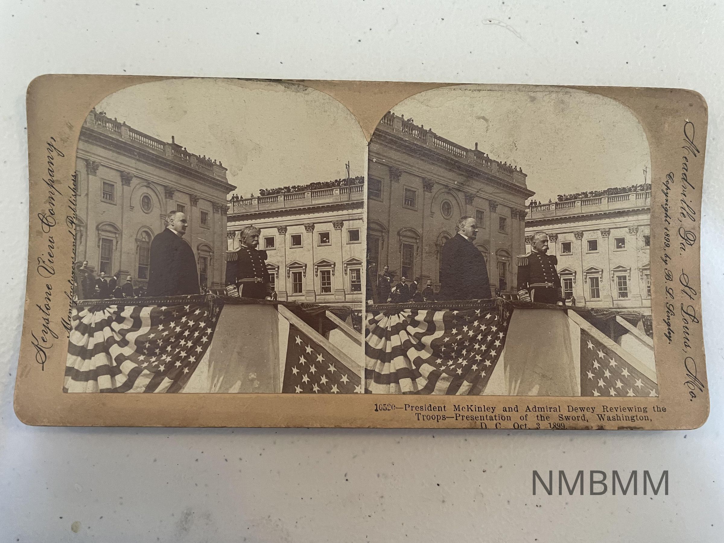 This item is a stereograph containing two images of President McKinley and Admiral George Dewey reviewing troops at the sword presentation of Admiral Dewey in Washington, D.C. Copyright in 1899 by B.L. SingleyCollection