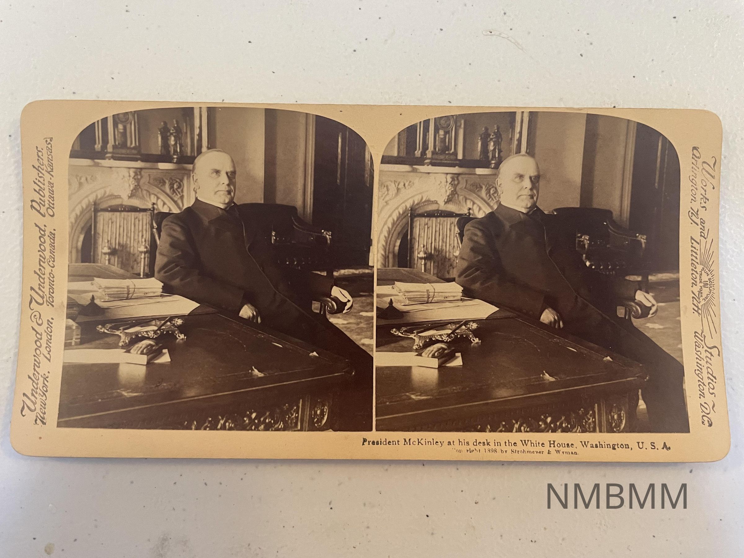 This item is a stereograph containing two images of President McKinley sitting, and leaning back in his chair in the White House.