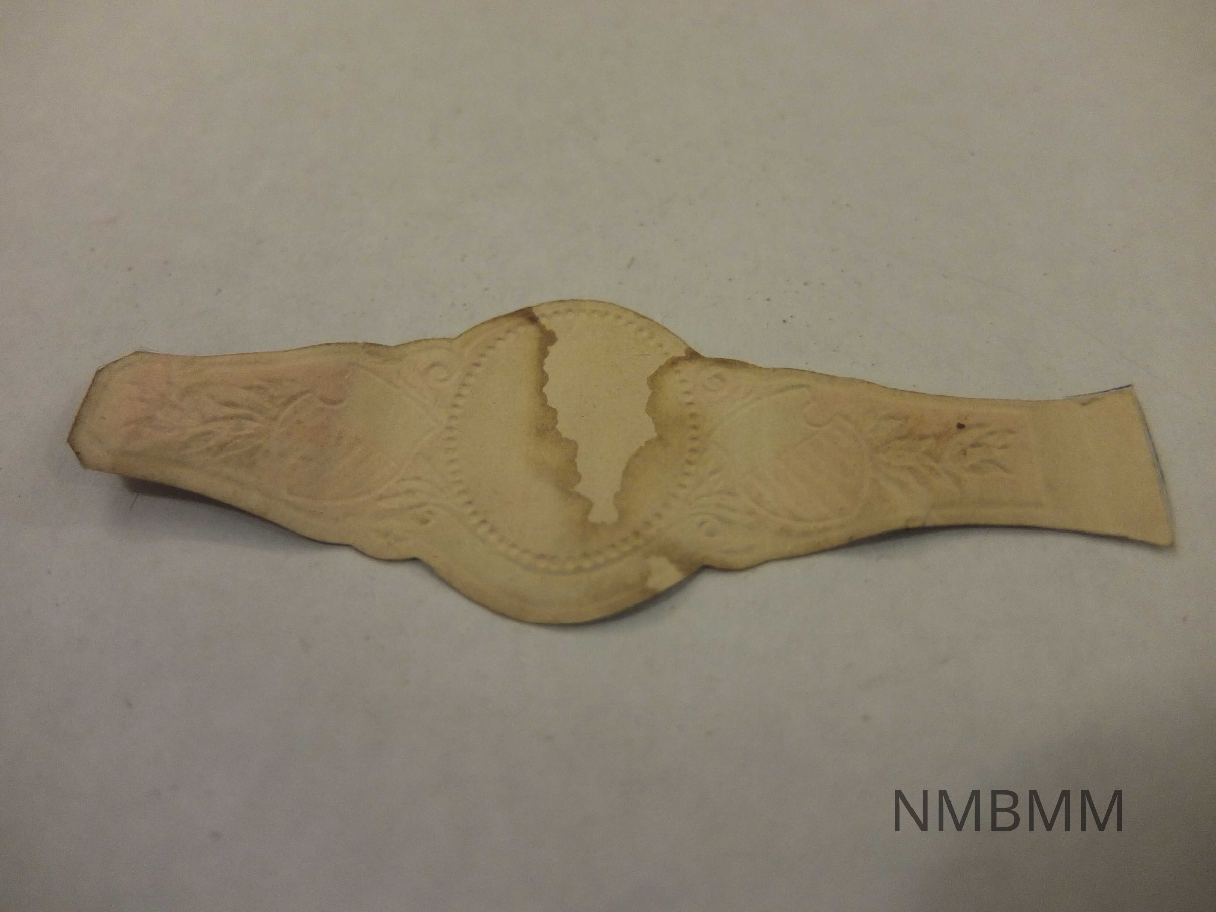 This item is a small cigar wrapper with President's McKinley's face on it with patriotic shields and olive branches. The colors are red, white, blue, and gold. 3 1/8 inches x 1 1/8 inches.
