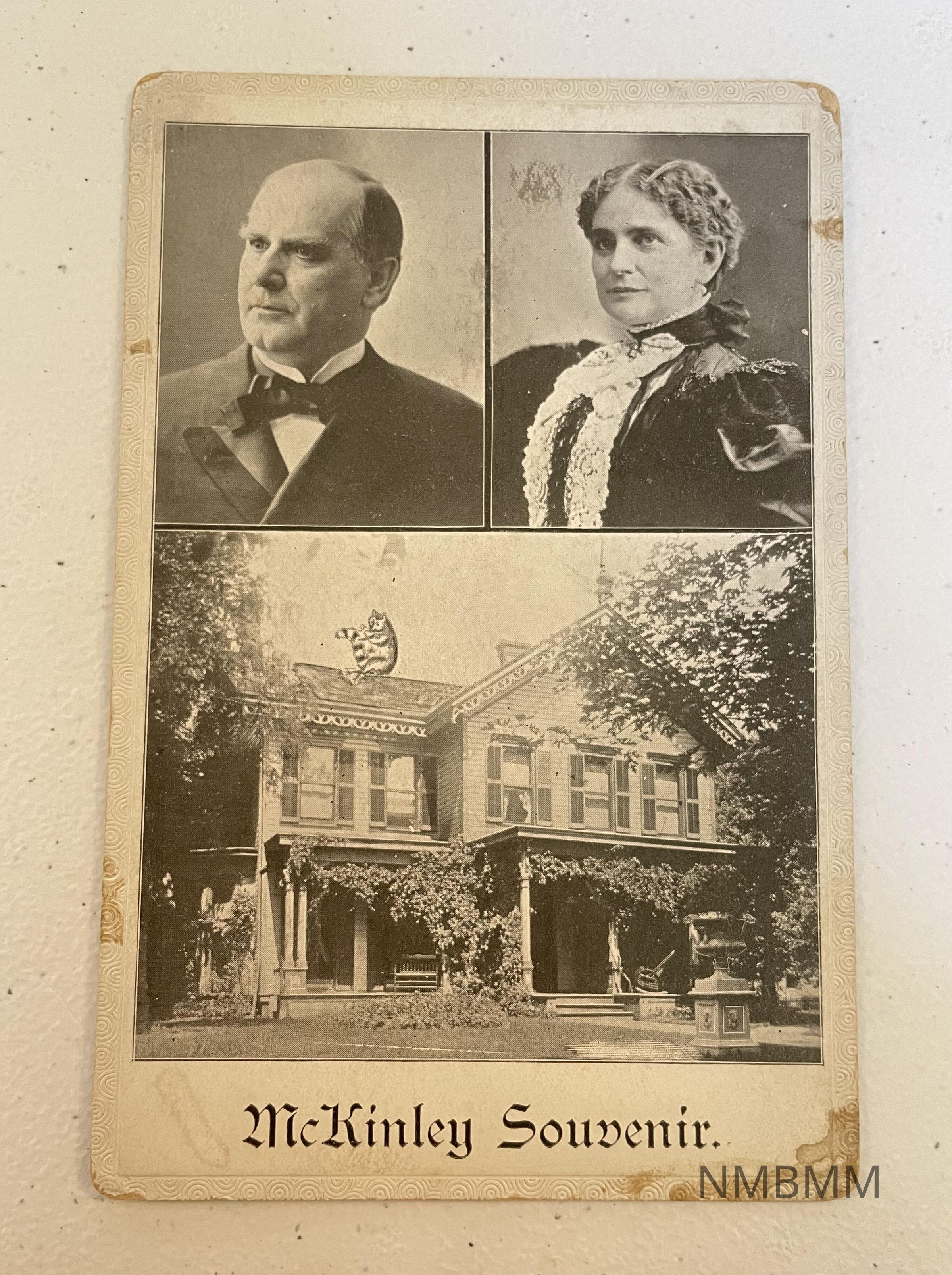 McKinley Souvenir card featuring portraits of William and Ida and their Canton, Ohio home.