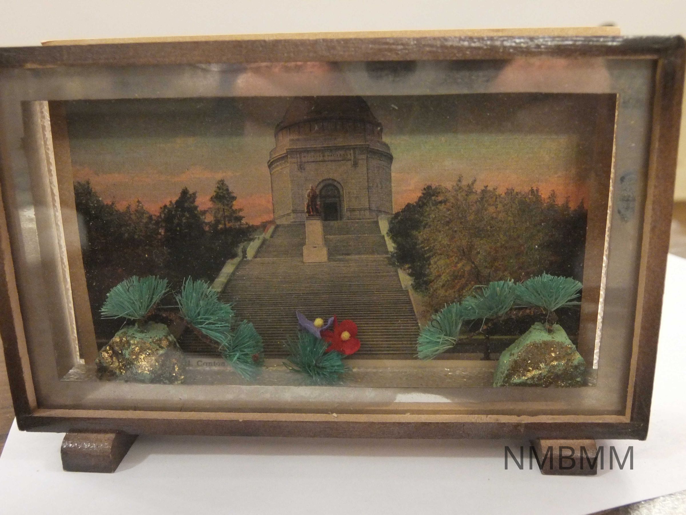 Shadowbox with trees coming from land in foreground and small floral arrangement. All in front of a postcard showing McKinley's tomb in Canton, Ohio. The shadowbox itself consists of a wood frame on the sides and top, and a piece of glass on the front and back.Collection
