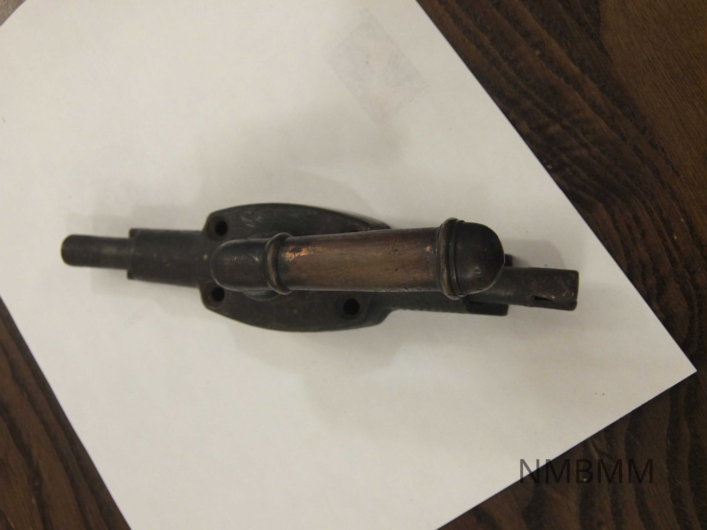 French door handle. This handle is made of metal, and consists of a lever-type door knob, and a hollow-barrelled bolt. The end of one of the bolts is broken.Collection