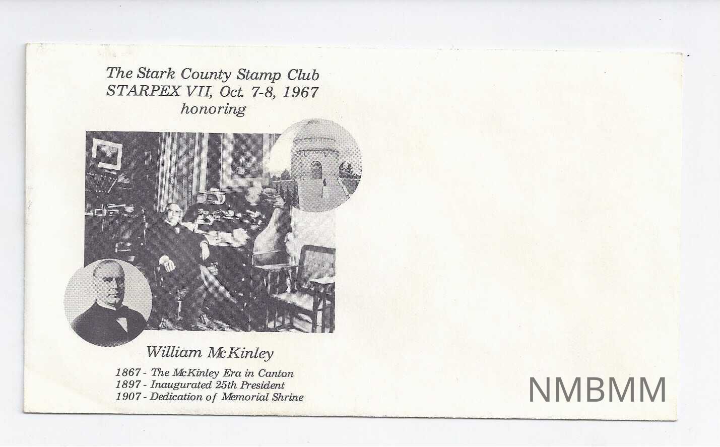 Envelope for the Stark County Stamp Club Starpex VII. The envelope reads as follows. on the right side, "The Stark County Stamp Club STARPEX VII, Oct. 7-8, 1967 honoring William McKinley 1867-The McKinley Era in Canton, 1897-Inaugurated 35h President, 1907-Dedication of Memorial Shrine" The center picture shows William McKinley in his Canton office. The small designs show the Memorial Monument and the President. the back of the envelope is blank.Collection