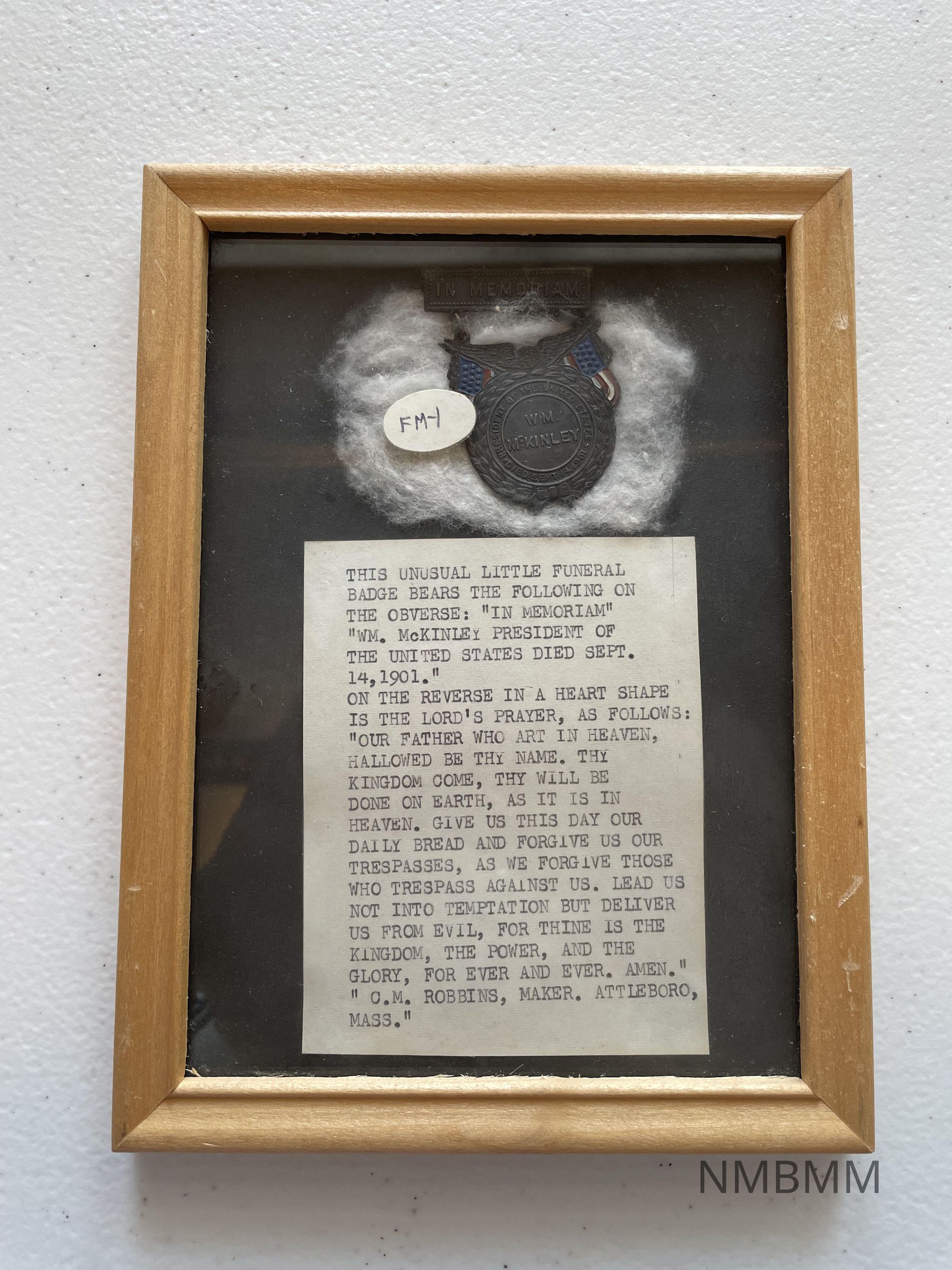Funeral badge from in memoriam to President McKinley, with the Lord's Prayer on the reverse, 1901