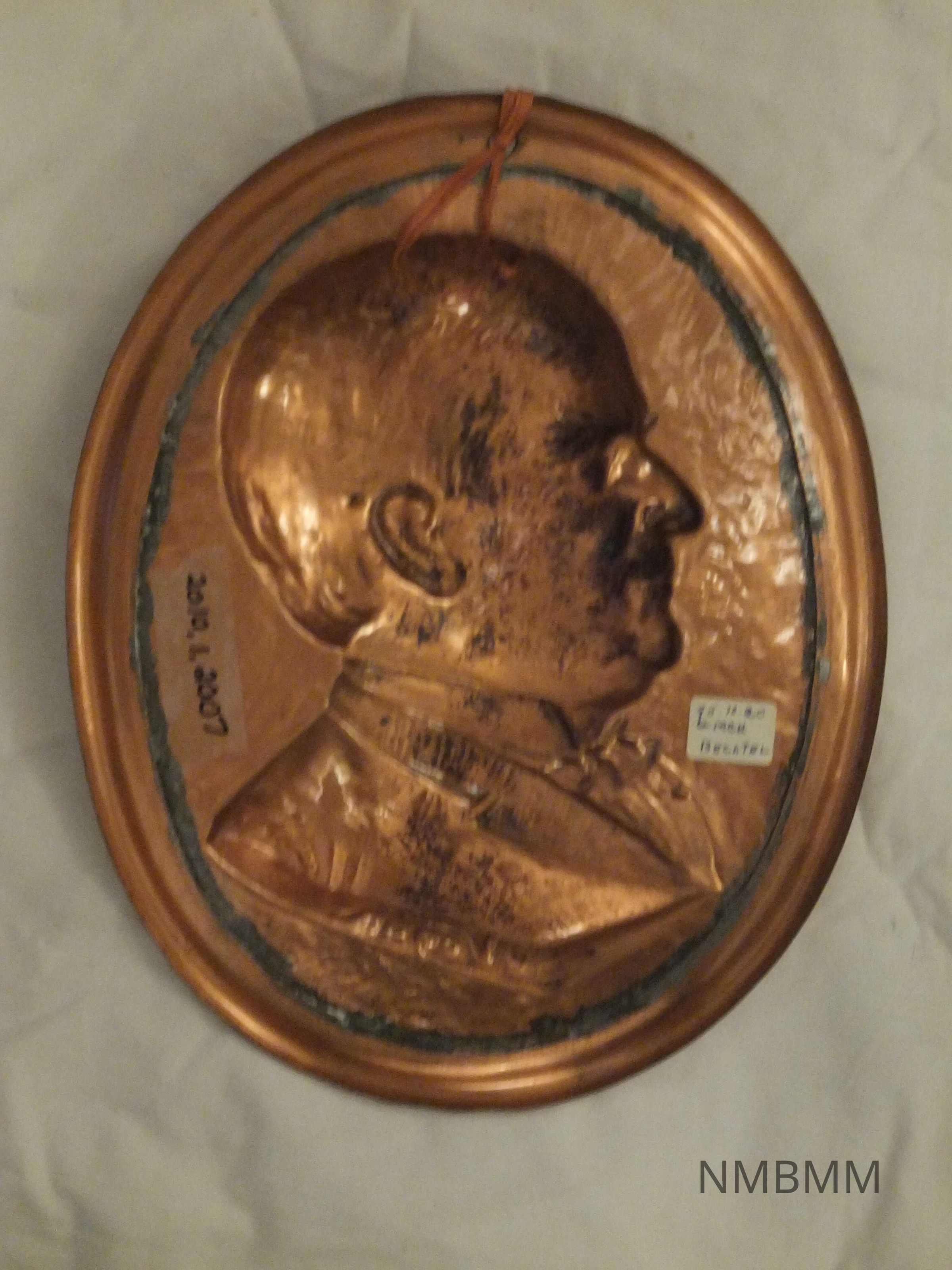 Copper oval relief plaque of President McKinley. There is a hole for hanging with a ribbon attached above McKinley's head.