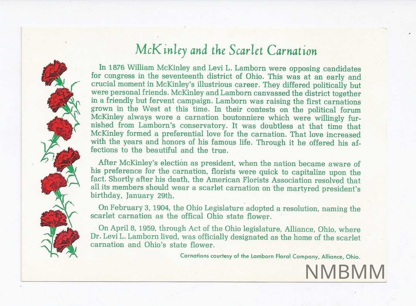 McKinley and the Scarlet Carnation information card. This card contains information about how McKinley became associated with the scarlet carnation. The card is white with green lettering. Seven red carnations line the left side of the card. The back of the card is blank.