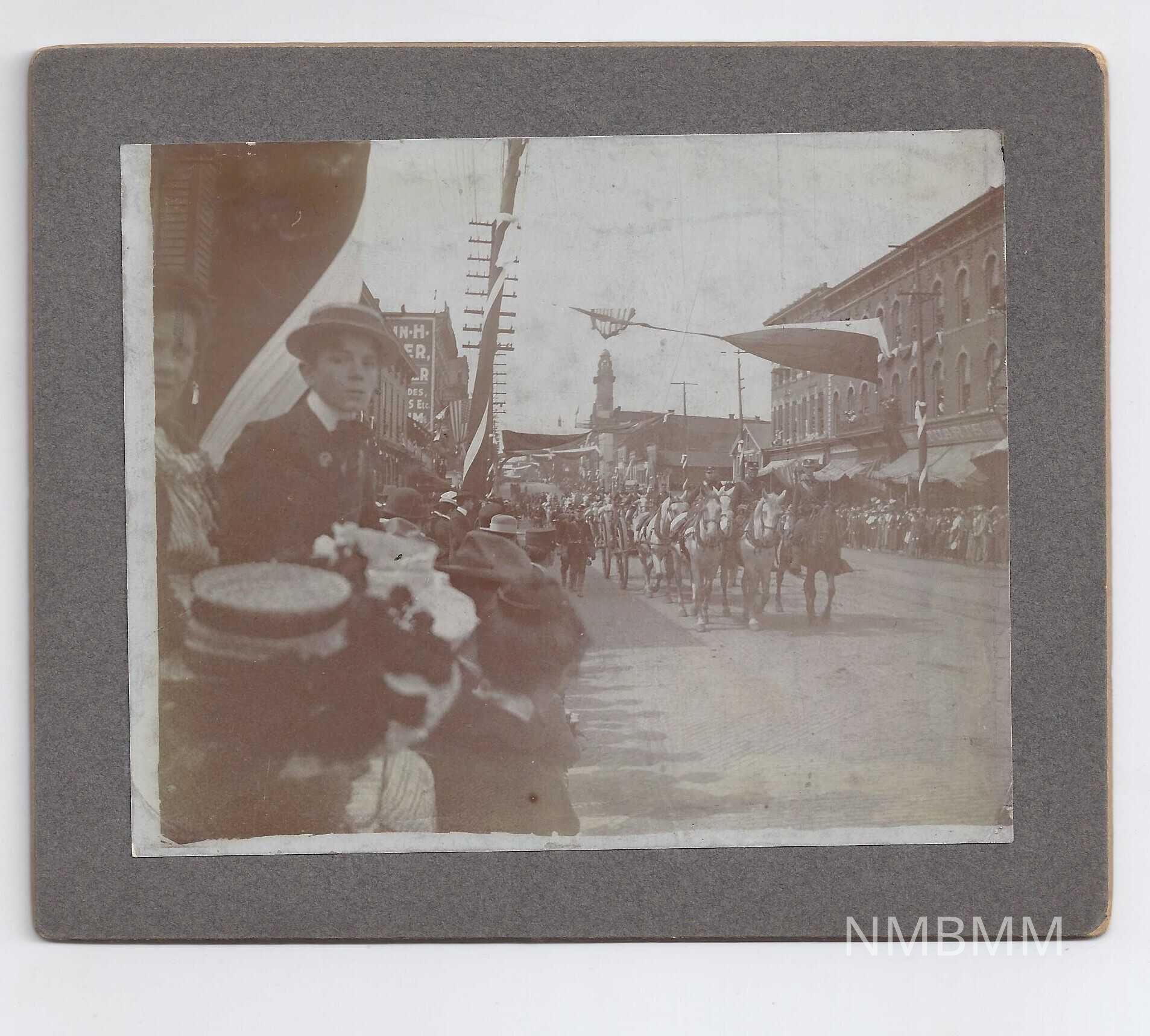 carte de viste of crowds at McKinley's funeral near the Stark County Courthouse in Canton, Ohio. The image shows a young man in the crowd looking at the camera on the left of the image, with the funeral procession approaching in the center of the image.Collection