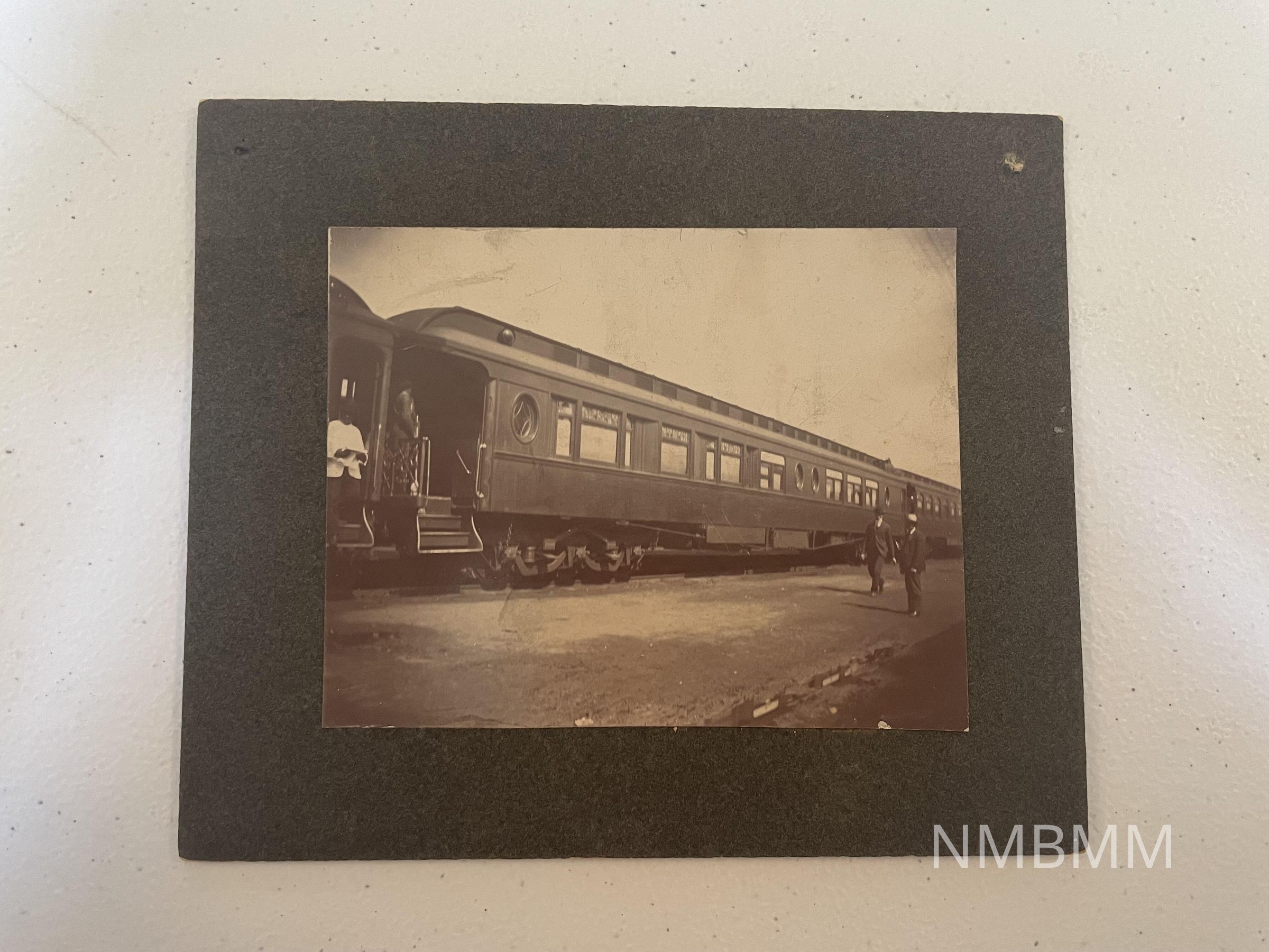 Carte de Viste of McKinley's Funeral Train at the station. Two men are standing off to the side, and railroad porter is on the steps of car in front.Collection