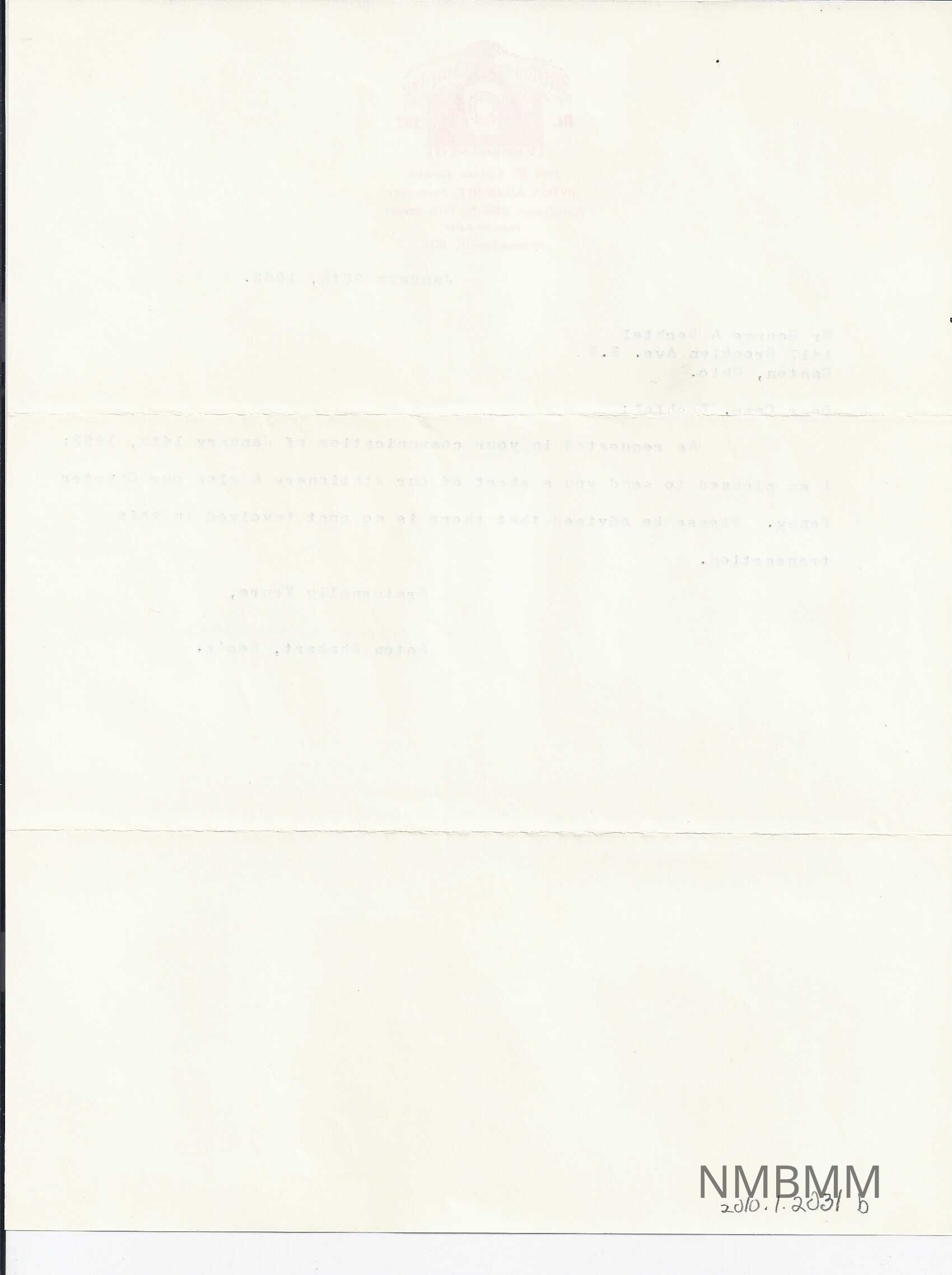 McKinley Chapter No. 102 R.A.M.'s letter to George A Bechtel in repsonse to Mr. Bechtel's request for a sheet of the organization's stationery. The centered letterhead is typeset in red ink and includes the logo of the McKinley Chapter No. 102 R.A.M. centered on the page with "3903 W. Lisbon Avenue ANTON SHABART, Secretary Residence: 2355 N. 55th Street Phone 111 4-4554 Milwaukee 10, Wis." The letter is typed in black ink and reads as follows: "January 26th, 1962. Mr George A Bechtel 1417 Brooklyn Ave. S.W. Canton, Ohio. Dear Comp. Bechtel: As requested in your communication of January 14th, 1962: I am pleased to send you a sheet of our stationery & also our Chapter Penny. Please be advised that there is no cost involved in the transaction. Fraternally Yours, Anton Shabart, Sec'y." Mr. Shabart's handwritten signature is between "Fraternally Yours" and his typewritten name and title. the back of the page is blank.Collection