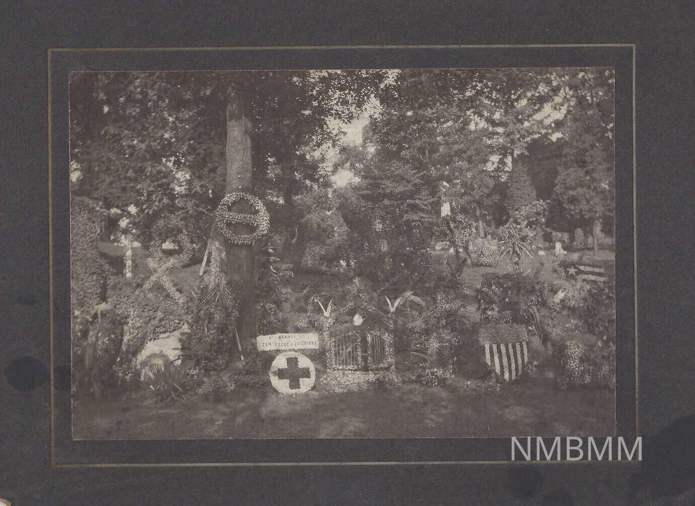 Flowers at West Lawn Cemetery Canton, Ohio. The image includes floral tributes in the shape of shields, crosses, crucifixes, and one inscribed "On Behalf of Tennessee's Soldiers."