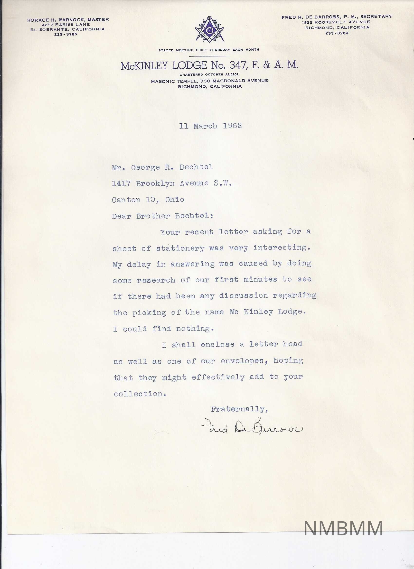 Letter sent by McKinley Lodge No. 347 F. & A.M. Richmond, California in response to Mr. Bechtel's request for samples of their stationery. Mr. Bechtel was setting up a collection of letterheads of all Masonic Lodges named for McKinley. The letterhead is typeset in navy ink and reads as follows. In the upper left corner is "HORACE H. WARNOCK, MASTER 4217 FARISS LANE EL SOBRANTE, CALIFORNIA 223 -3785." In the upper right corner is FRED R. DE BARROWS, SECRETARY 1833 ROOSEVELT AVENUE RICHMOND, CALIFORNIA 223-0264." The Masonic Symbol is in the center, with the following beneath: "STATED MEETING FIRST THURSDAY OF EACH MONTH MCKINLEY LODGE No. 347, F. & A. M. CHARTERED OCTOBER AL5902 MASONIC TEMPLE, 730 MCDONALD AVENUE RICHMOND, CALIFORNIA"