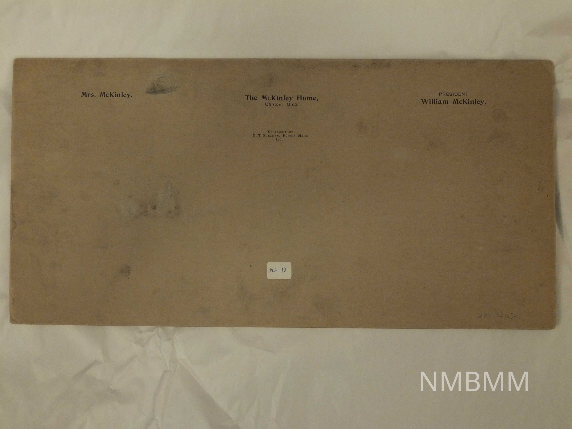 Display of three photos: President McKinley, the McKinley Home in Canton Ohio, and Mrs. McKinley. The images are matted in the same grey mat. The back reads as follows: "Mrs. McKinley, The McKinley Home Canton, Ohio, President William McKinley. Copyright by M.T. Sheahan, Boston, Mass. 1900."Collection