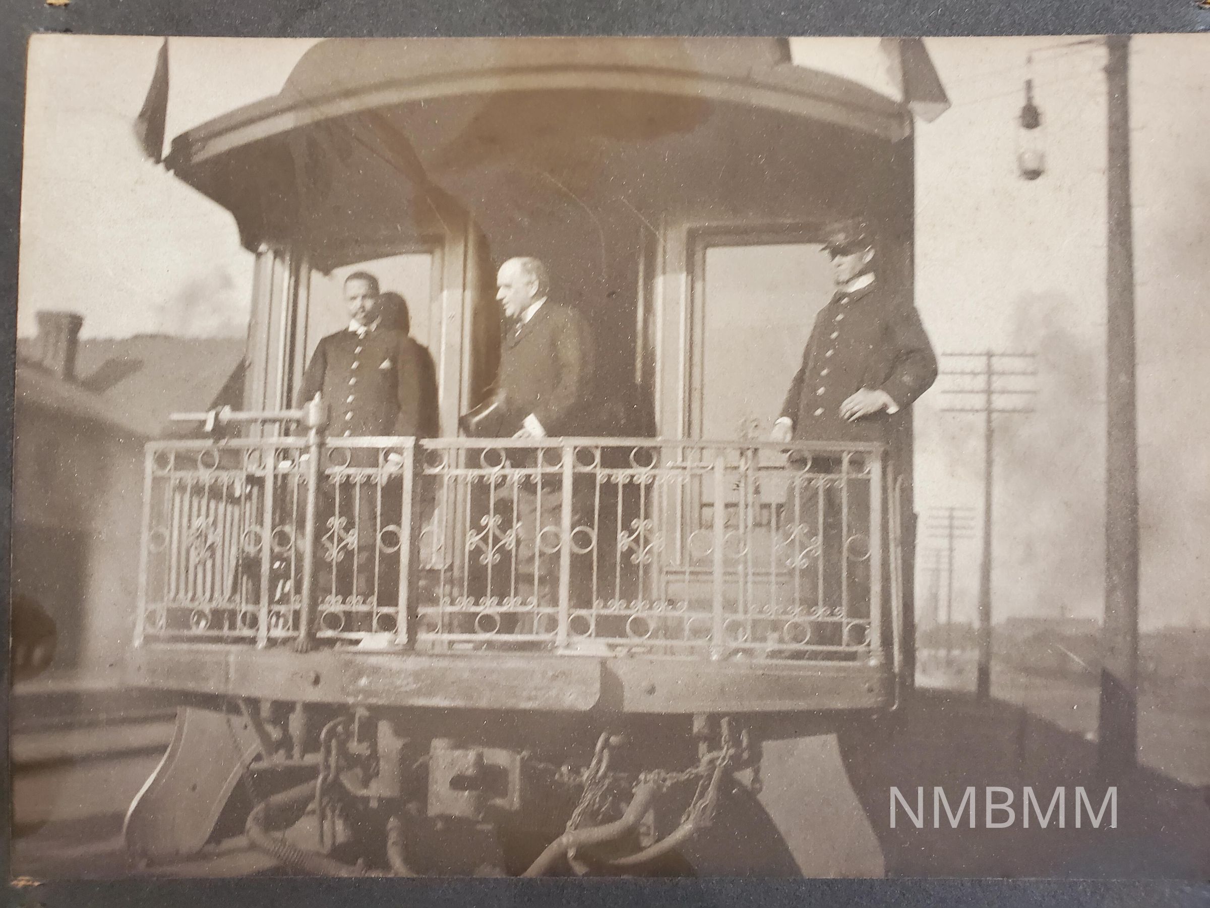 President McKinley and two others on the caboose of train leaving Canton, Ohio for Buffalo, September 1901. This is an image of the last time McKinley left Canton.