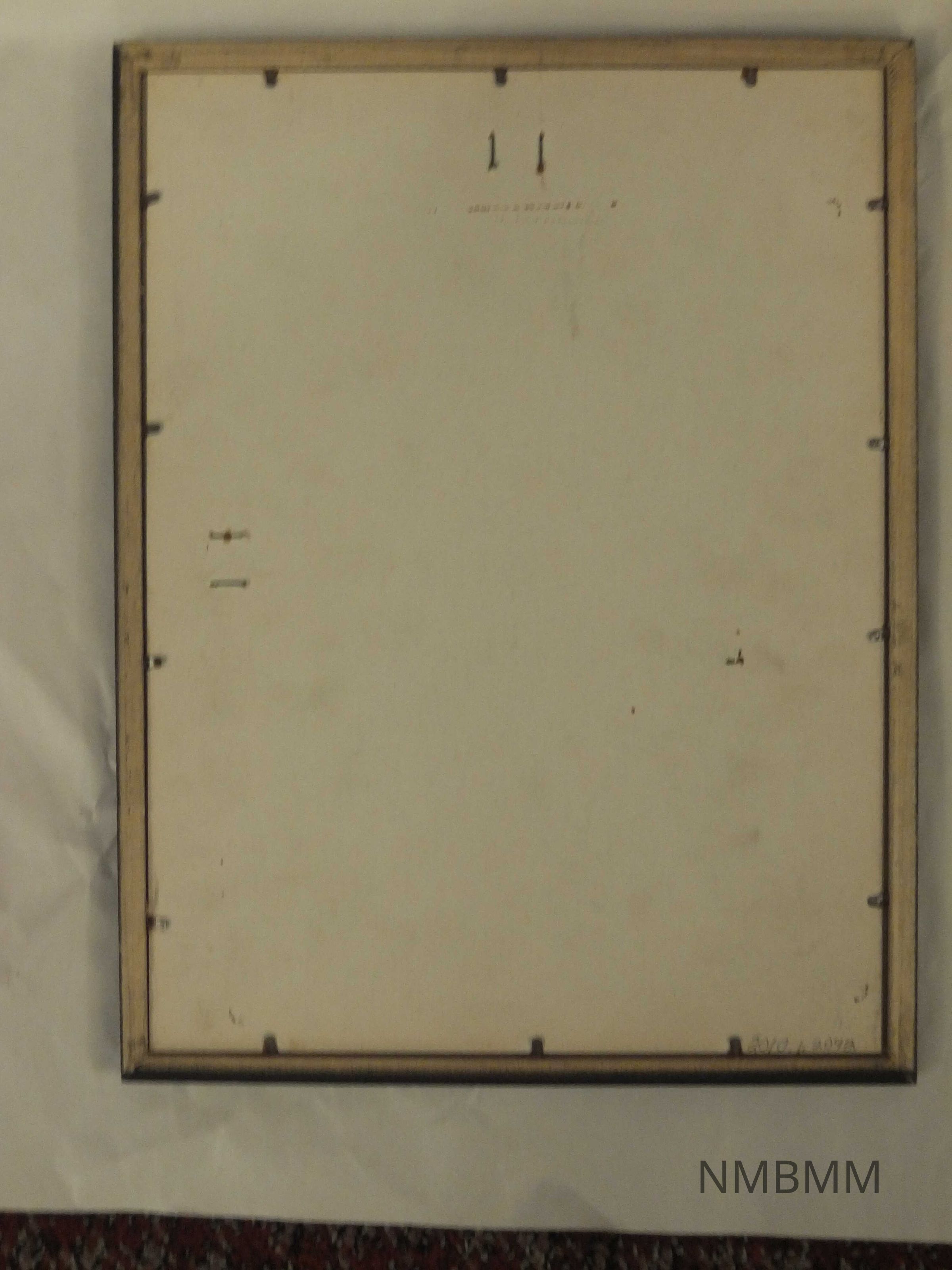 The button and word are framed in a 9.75 x 12.75 inch wood frame, with glass. The back of the frame is plain.Collection
