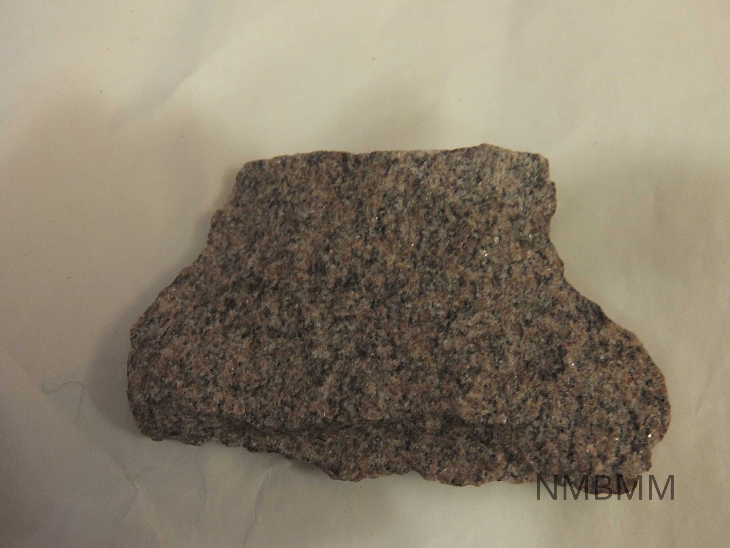 Piece of granite. Three sides are undressed, one side is dressed and polished. Red/pink with shiny flecks.