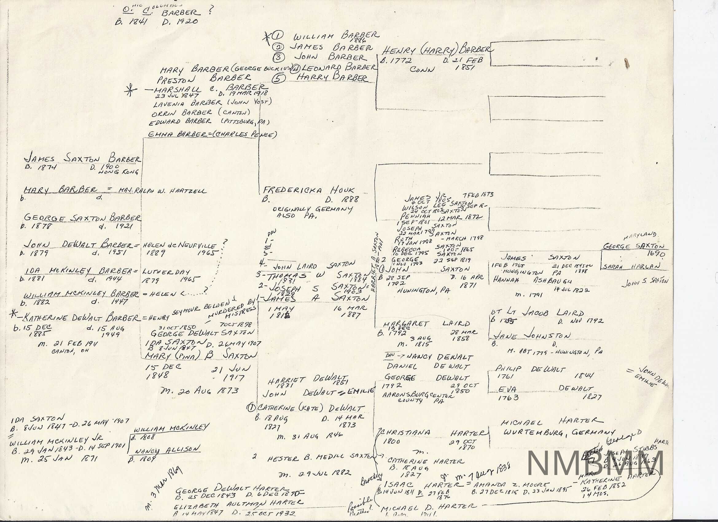 Xeroxed copy of handwritten McKinley/Saxton/ Barber/Harter/DeWalt family tree. IT traces several generations of these families. The back is blank.Collection