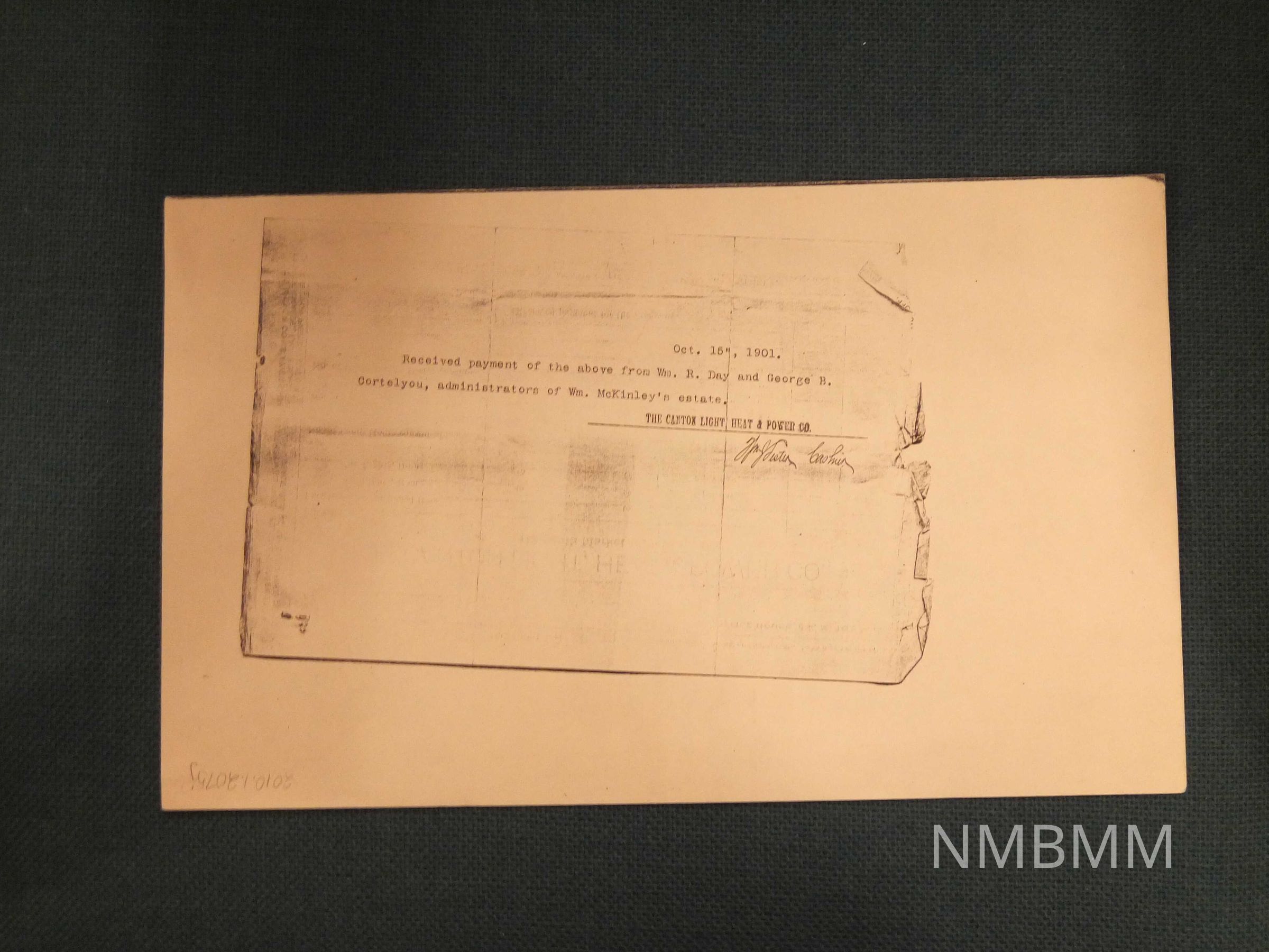 "Oct. 15th, 1901 Received payment of the above from Wm. R. Day and George B. Cortelyou, administrators of Wm. McKinley's estate. The Canton Light, heat, and Power Co." It is signed by Wm Foster, Cashier.Collection