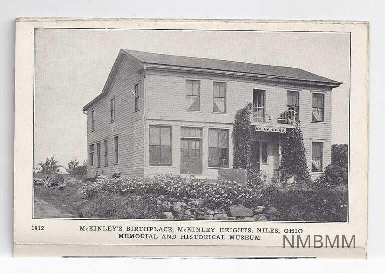 Postcard booklet of eight black and white McKinley-related postcards. This is the sixth card. The front shows an image of "McKinleys Birthplace, McKinley Heights, Niles, Ohio Memorial and Historical Museum 1912."