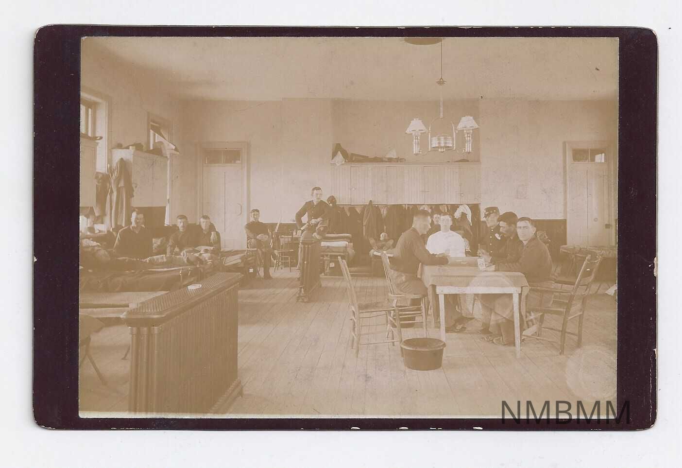 Cabinet card showing eleven men in a mess hall. The image is sepia-toned, with a black mat. Most of the men are seated at tables, with one man standing near the center. "9" is handwritten on the back left of the mat.