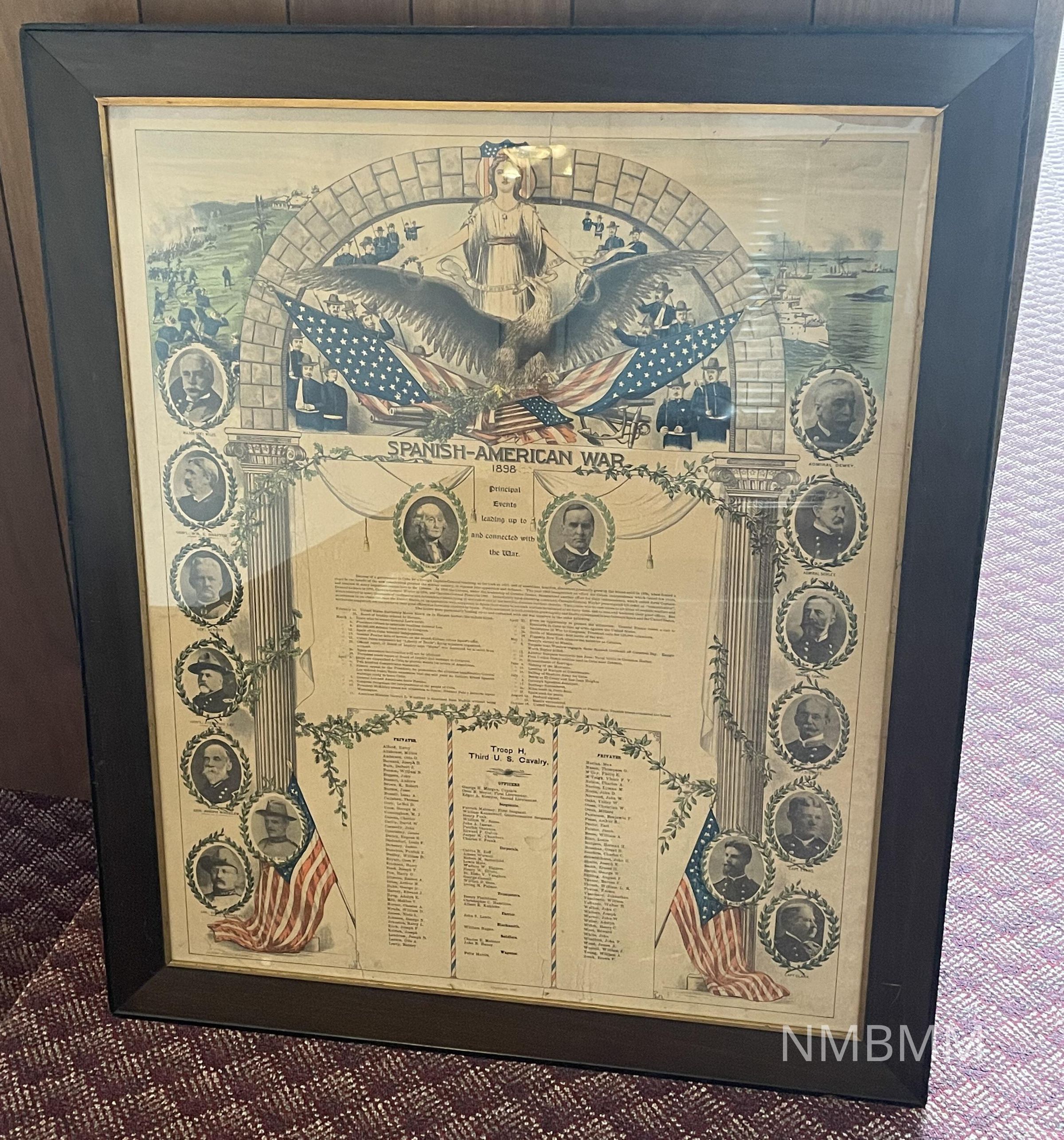 Chart of Spanish American War 1898. Outside the arch, on either side, scenes of battleships and battles are depicted. The words "Spanish-American War 1898" sit above a sketch of George Washington on the left, and William McKinley on the right. In between the two Presidents are the words "Principal Events leading up to and connected with the War." A timeline of events is listed, and below that are three columns of the names of members of "Troop H, Third U. S. Cavalry." On the sides of these pillars, right and left, are photographs of Military Officers.