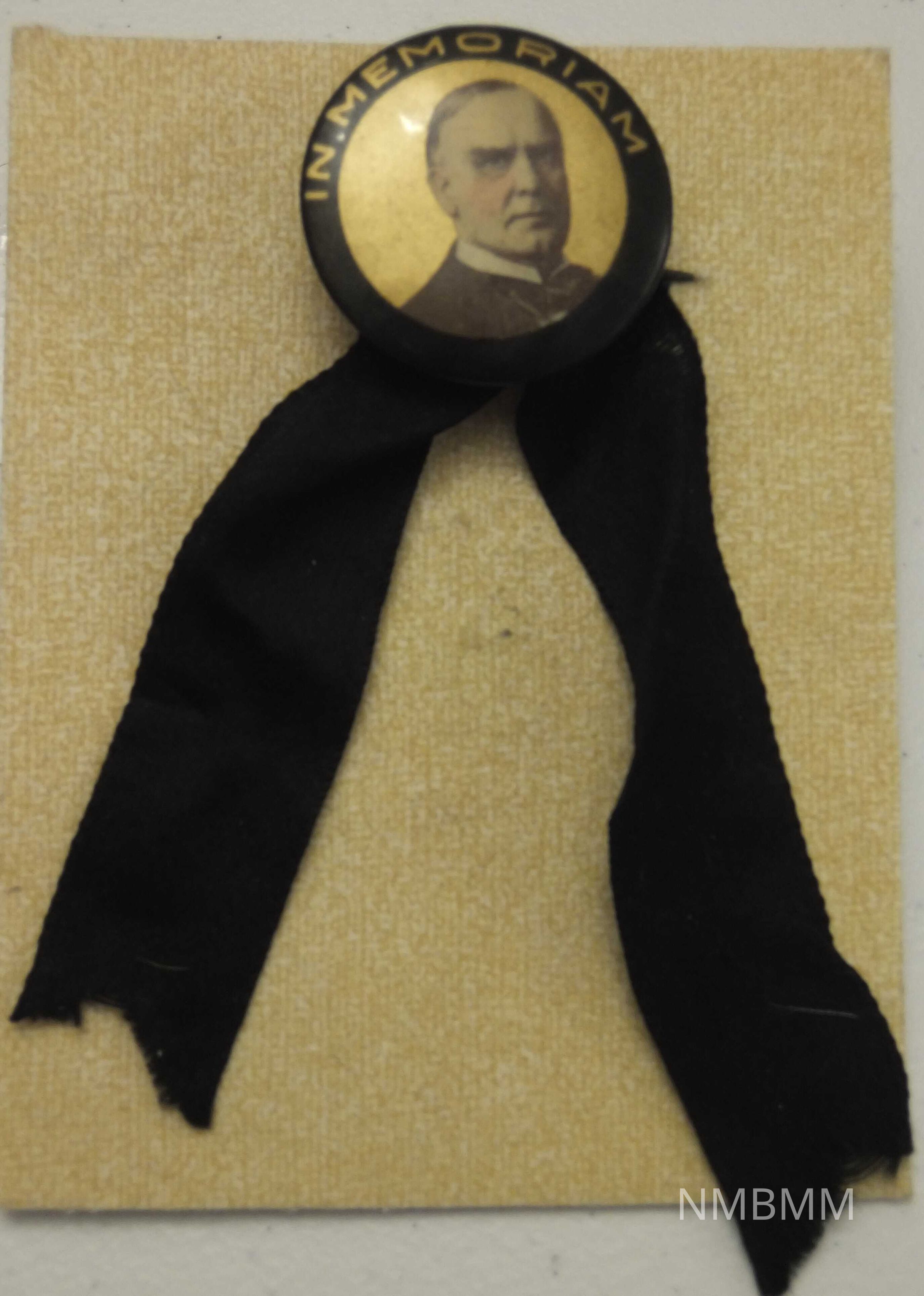 This item is a gold and black metal and cloth pin containing a portrait of President McKinley with the words "In Memoriam" at the top. The pin is 1.5 inches in diameter and is attached to a 4.5 inch black double ribbon.Collection