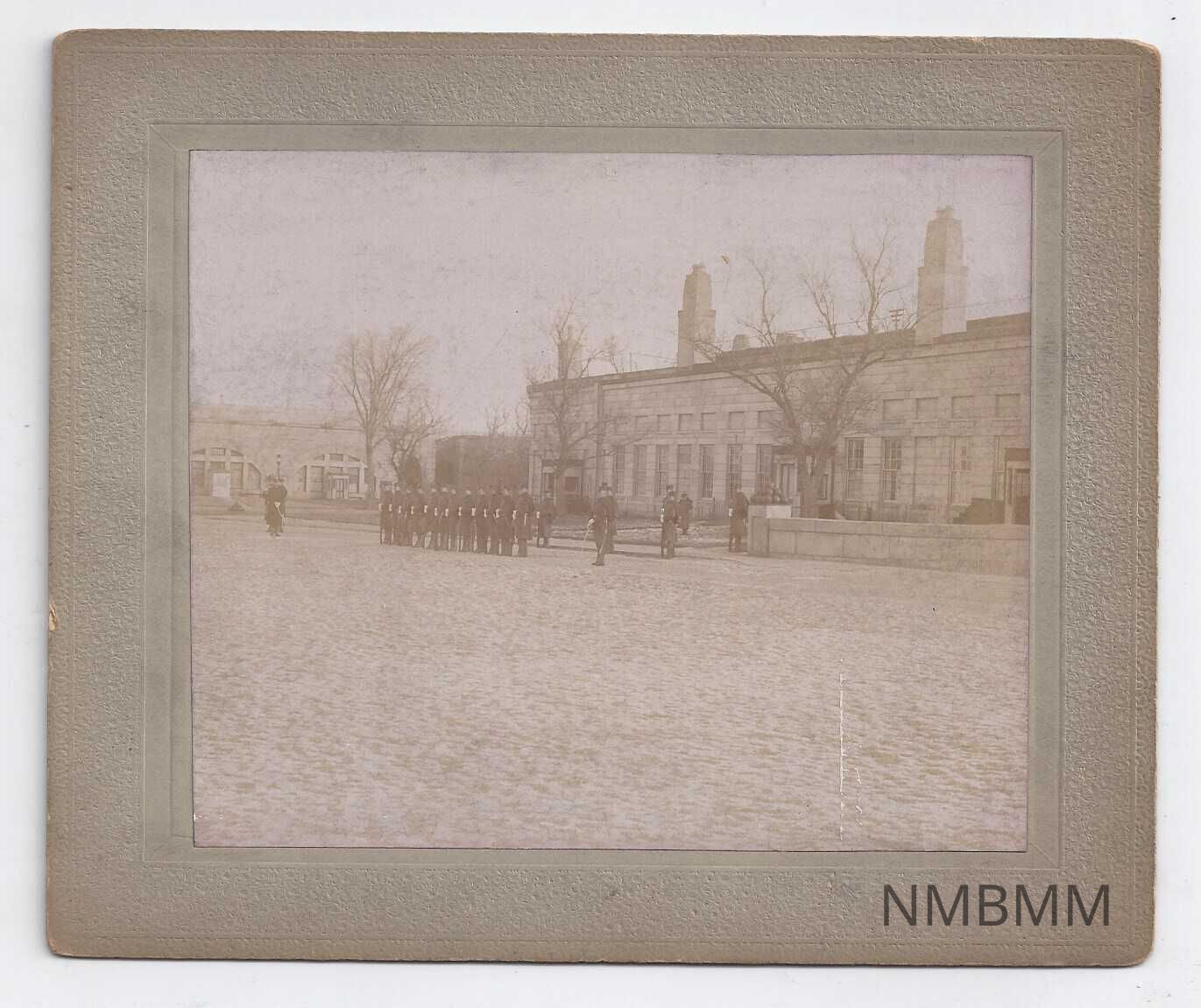 Cabinet card showing troops being reviewed in front of a building with three chimneys. The image is sepia-toned, with a beige mat. "37" is handwritten on the left side of the back.Collection