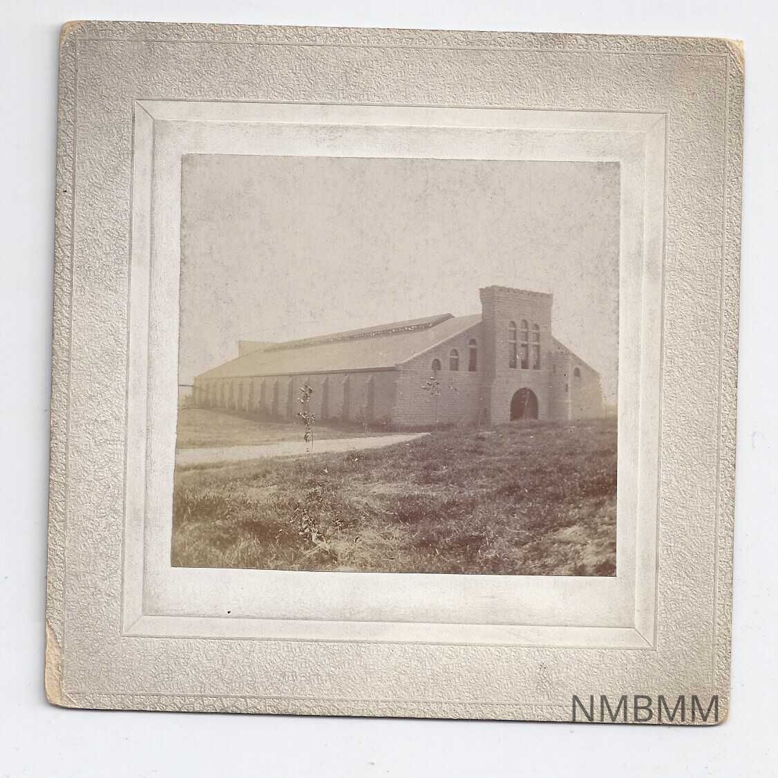 Cabinet card showing an unknown long building with arched windows at the sides and front. The image is sepia-toned, with beige mat. "31" is handwritten on the back left side. Identified as: Fort Riley Riding Hall University of Kansas - Luna Insight Image Collection Pennell Photography Collection Pennell, Joseph Judd http://luna.ku.edu/luna/servlet/detail/kuluna01kui~15~15~2412527~261161?qvq=q%3AmediaCollectionId%3D%22kuluna01kui~15~15%22&mi=91&trs=5992