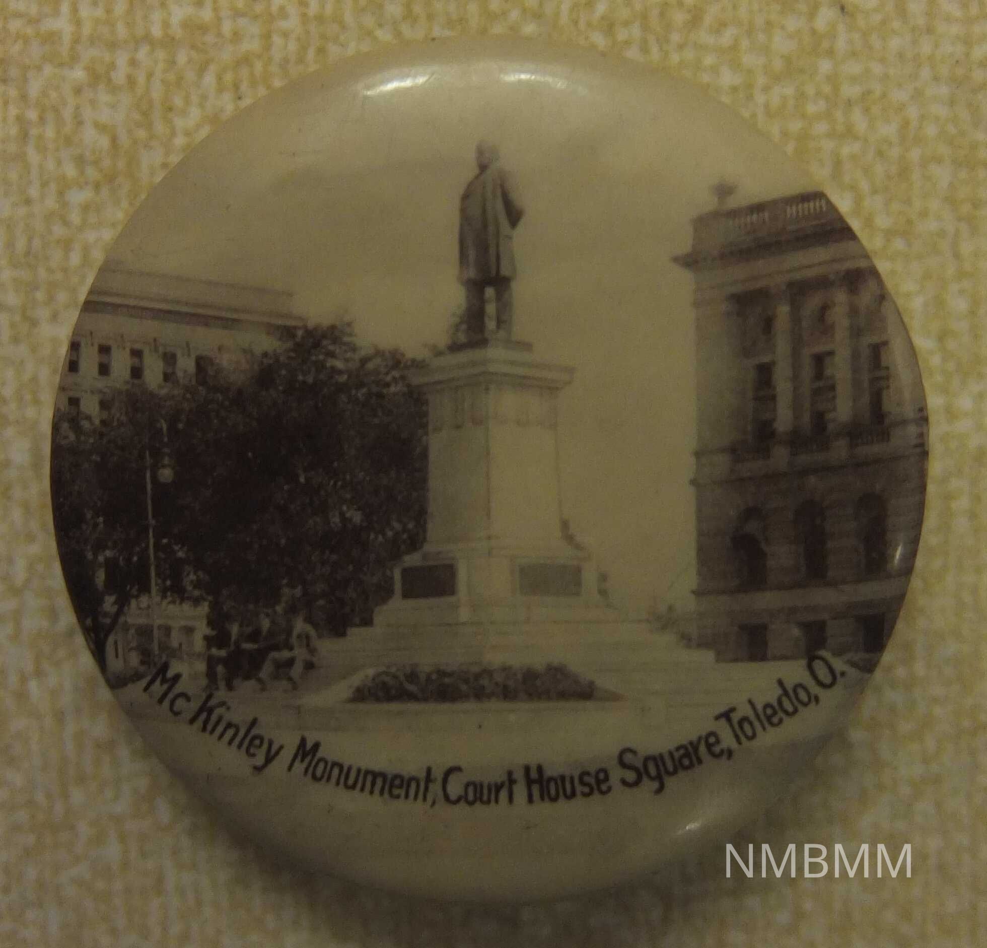 This is an ivory and sepia toned celluloid, metal and paper lapel pin, measuring 1 1/2 inches in diameter. A photo of the McKinley Monument in Toledo, Ohio is on the front. The back has a paper or cardboard insert with words that read "J. H. Taylor & Co. Toledo (?), Ohio. A pin is attached for use on clothing, ribbon or other materials.Collection