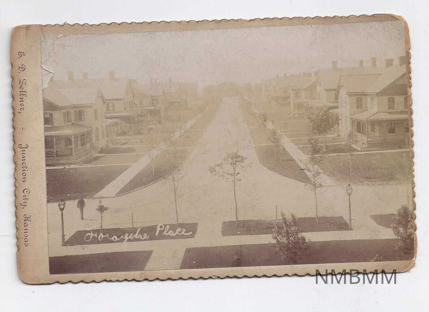 Cabinet card showing Forsythe Place, Junction City Kansas. The sepia-toned image shows a street with houses on both sides. Handwritten on the lower left side is a word that is difficult to read. It might say "Forsythe Place." Typeset on the left on the mat is "E.D. Zellner, - Junction City, Kansas."