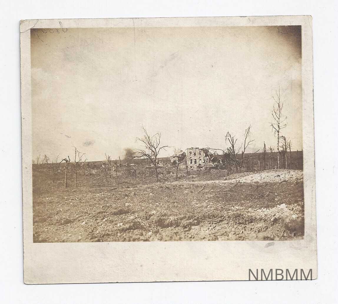 Photograph showing a damaged building and trees. The damage possibly occurred as the result of a tornado. The sepia-toned image is mounted on a beige mat. "C137" is handwritten on the back in the center.Collection