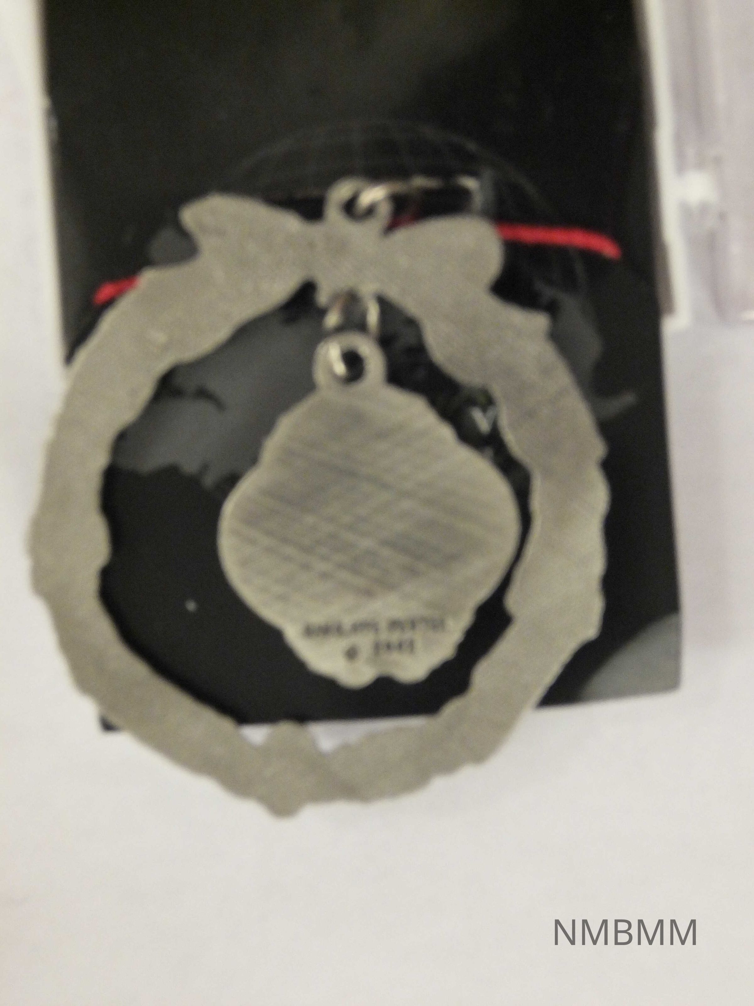 Pewter ornament. It is a wreath surrounding a medallion of the National McKinley Memorial in Canton. The back is plain, with tiny grid lines from the casting. Back of the medallion reads "Rawoliffe Pewter 2002" The ornament has a red cord hanger attached to it and is mounted on a black hanging card with "Bring Home a Memory" in white and "Encore at the bottom in gold. The ornament and card are in a plastic box with a clear clasping lid and a white back. There is a small price sticker with "4 13 15," "McKinley Museum Shoppe" and "$8.00" on it.Collection