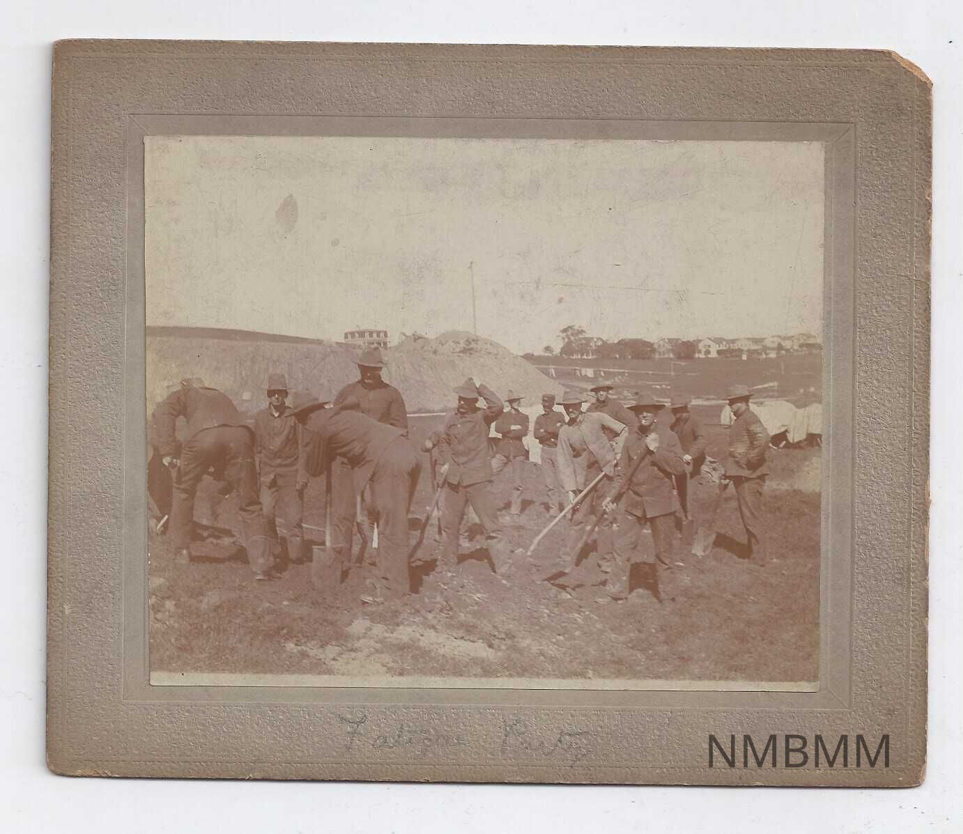 Cabinet card showing men on fatigue duty. The image is sepia-toned on a beige mat. "34" is handwritten on the back left side.