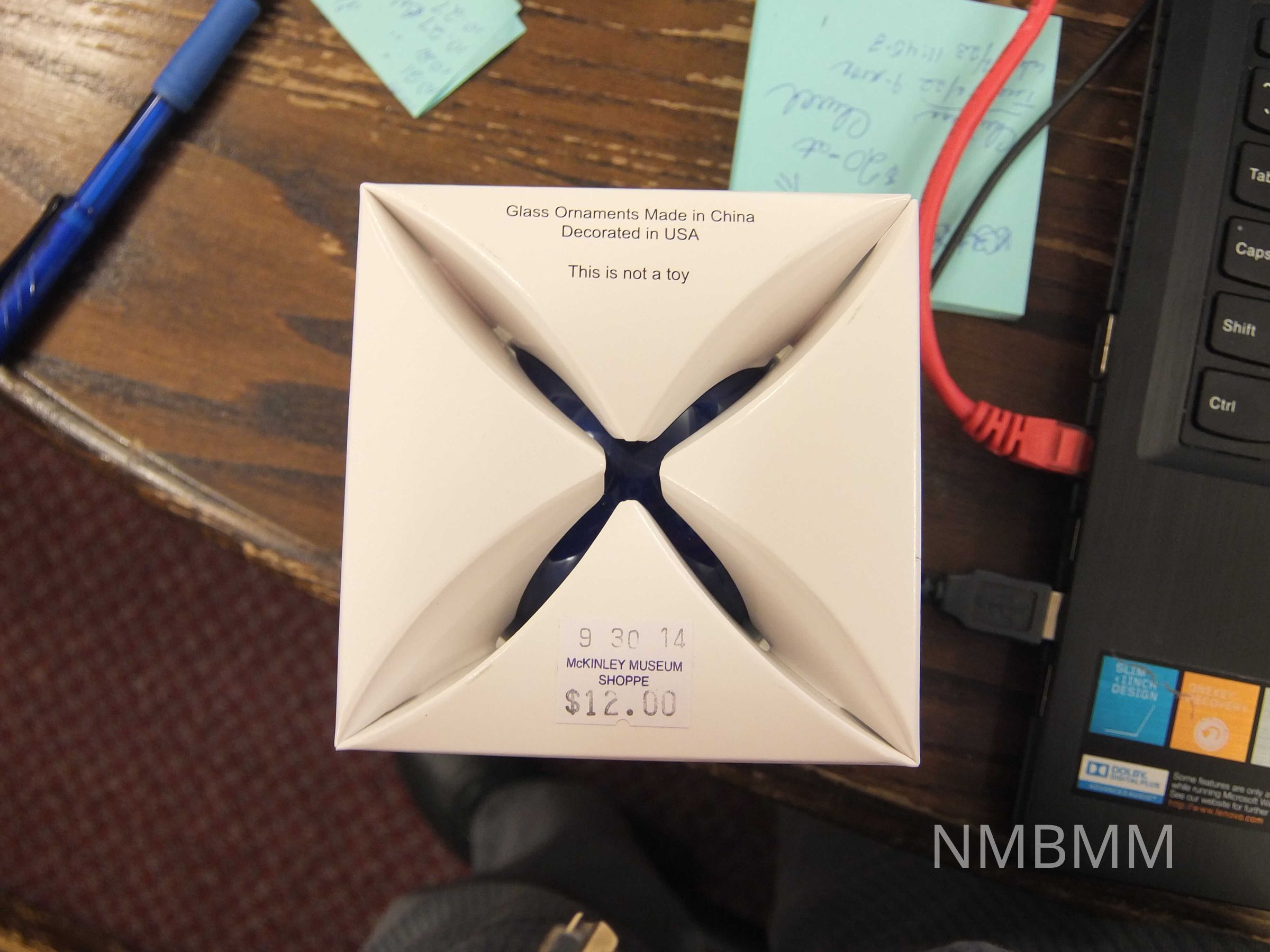 Blue glass bulb, 3 inches in diameter with gold crown and hook loop. The front of the ornament shows a sketch of the McKinley tomb with the words "McKinley Presidential Library & Museum Canton, OH" written in gold and then a concentric circle of gold reading "William McKinley 1897-1901" in blue lettering around the sketch. The Back of the bulb is plain.Collection