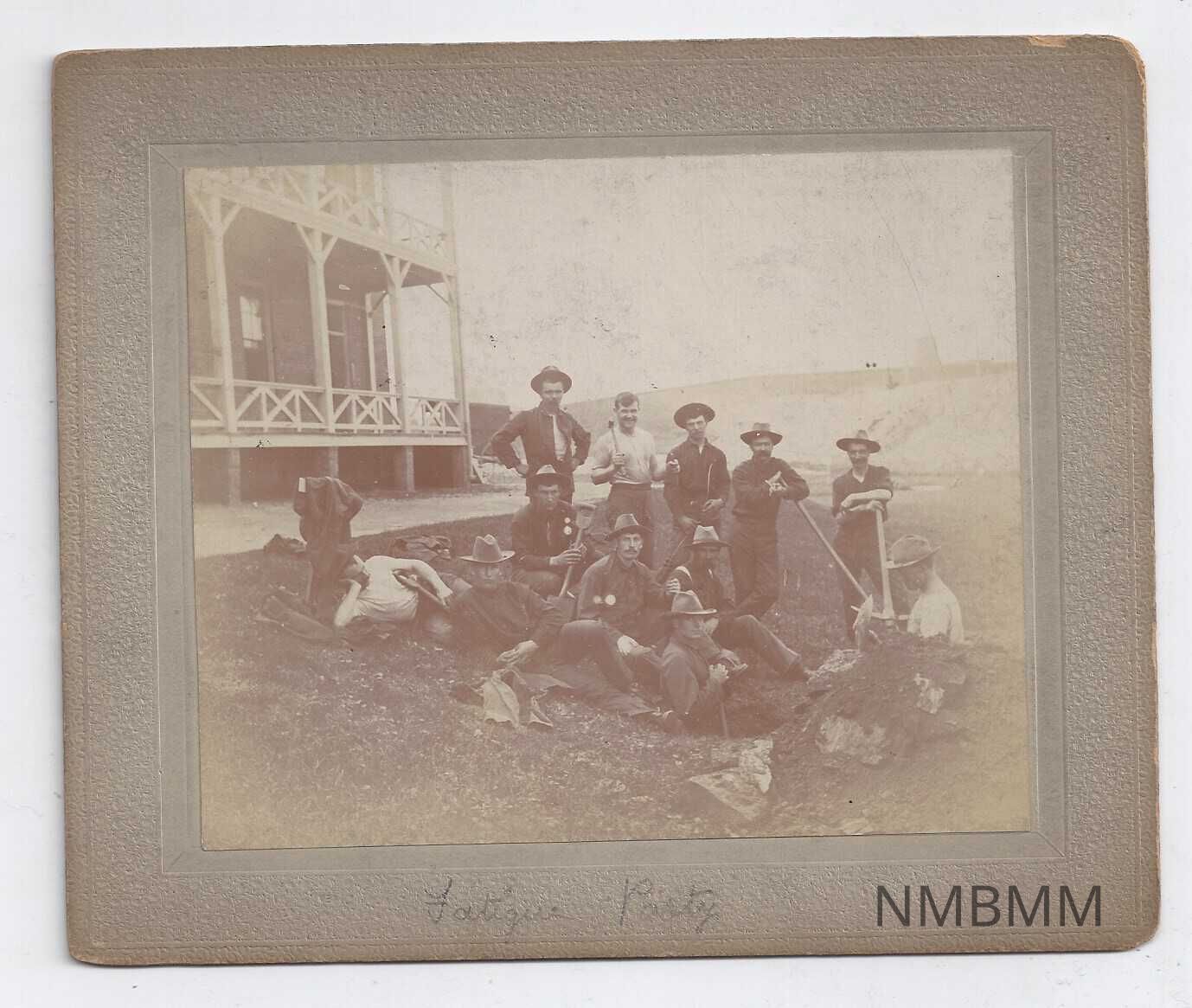 Cabinet card showing men on fatigue duty. There is a building on the left of the image. The image is sepia-toned. It is on a beige mat. "51" is handwritten on the back left side. The Collins Dictionary defines Fatigue duty (a.k.a fatgue party) as "fatigue duty (f?'ti?g 'dju?t?) noun (military) any of the mainly domestic duties performed by military personnel, esp as a punishment" (http://www.collinsdictionary.com/dictionary/english/fatigue-duty)