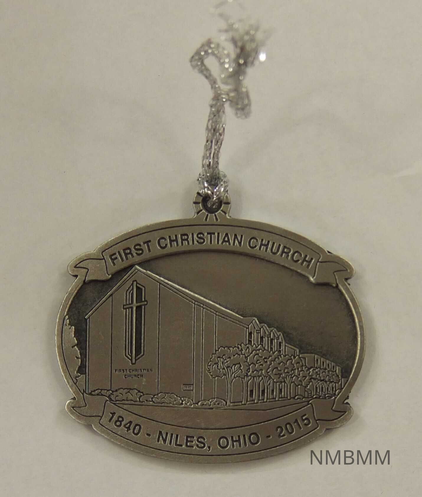 Pewter ornament with hanging loop at top. The front shows an engraving of the church building. Over the top of the engraving is a banner reading "First Christian Church." The banner at the bottom of the ornament reads " 1840--Niles, Ohio--2015." the back of the ornament features an engraving reading "175th Anniversary." Above this is a banner reading "Praise for the Past" and the banner on the bottom of the ornament reads "Faith for the Future." The ornament is housed in a small plastic box with a clear lid, black back, annd red velveteen insert.Collection