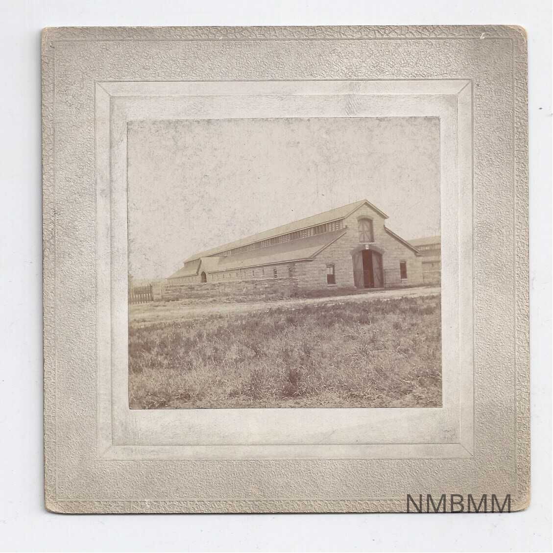 Cabinet card showing building with clerestory monitor. The image is sepia-toned. It is on a beige mat. "57" is handwritten on the back left side.Collection