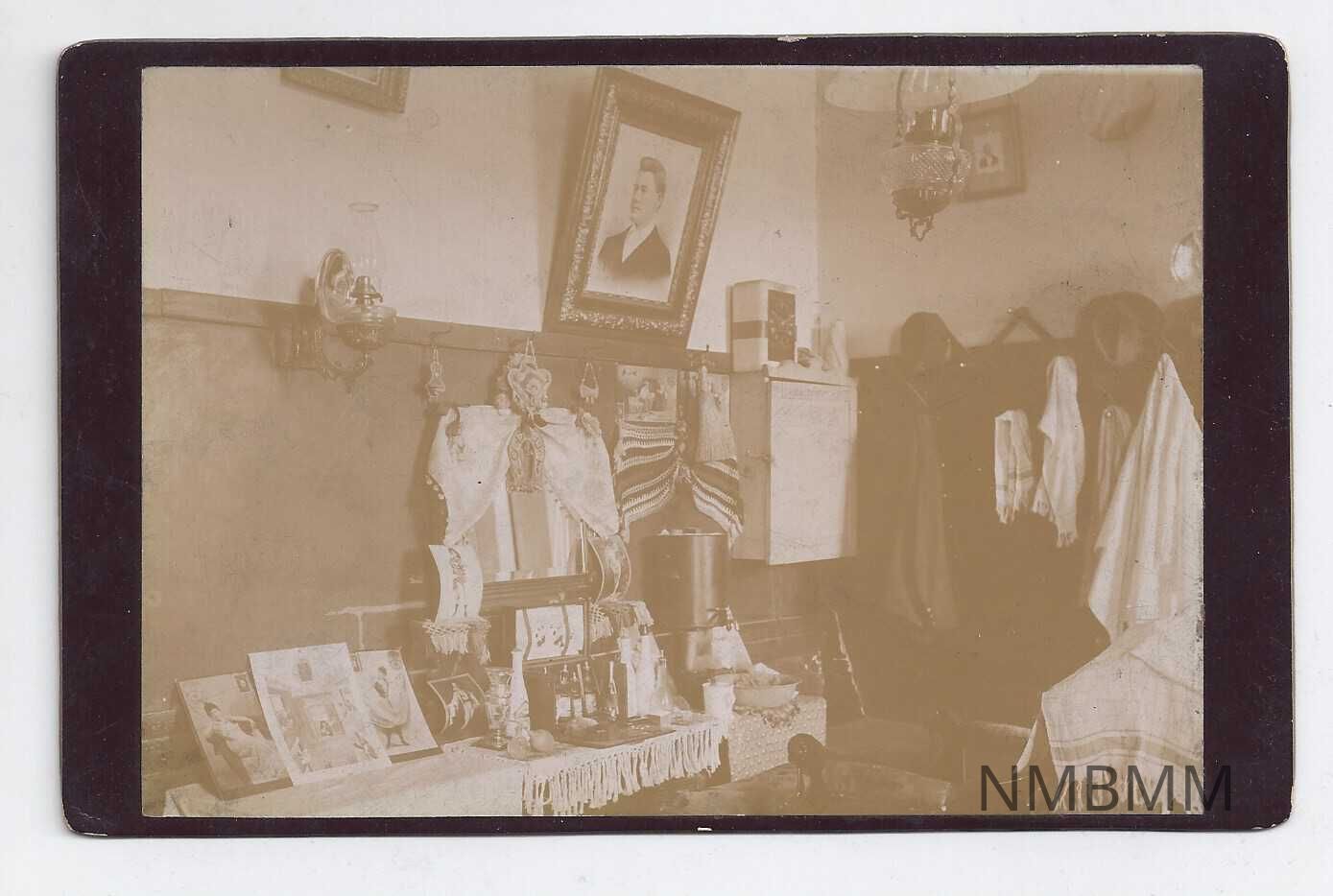 Cabinet card showing the image of a room with many phtos on the wall and tables, along with clothes hanging on hooks on the wall. The sepia-toned image is on a black mat. "16" is handwritten on the back left side.Collection