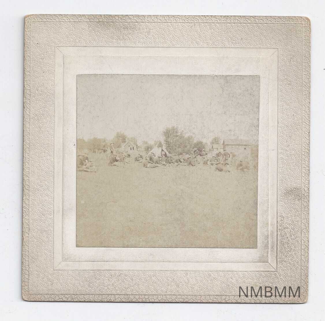Cabinet card showing the image of cavalry soldiers surrounding a tepee in the center of the image, with houses on the outer edges of the image. The sepia-toned image is on a beige mat. "59" is handwritten on the back left side.Collection