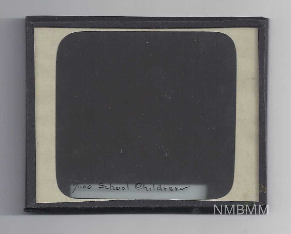 This is a negative glass slide shows soldiers passing 7,000 school children either during the funeral procession or day of the McKinley Memorial dedication in Canton, Ohio.Collection