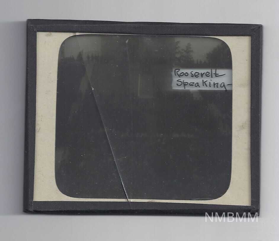 This is a negative glass slide shows President Roosevelt speaking at the dedication of the William McKinley Memorial in Canton, Ohio on September 30, 1907. This slide has two severe cracks in the glass running from top to bottom.