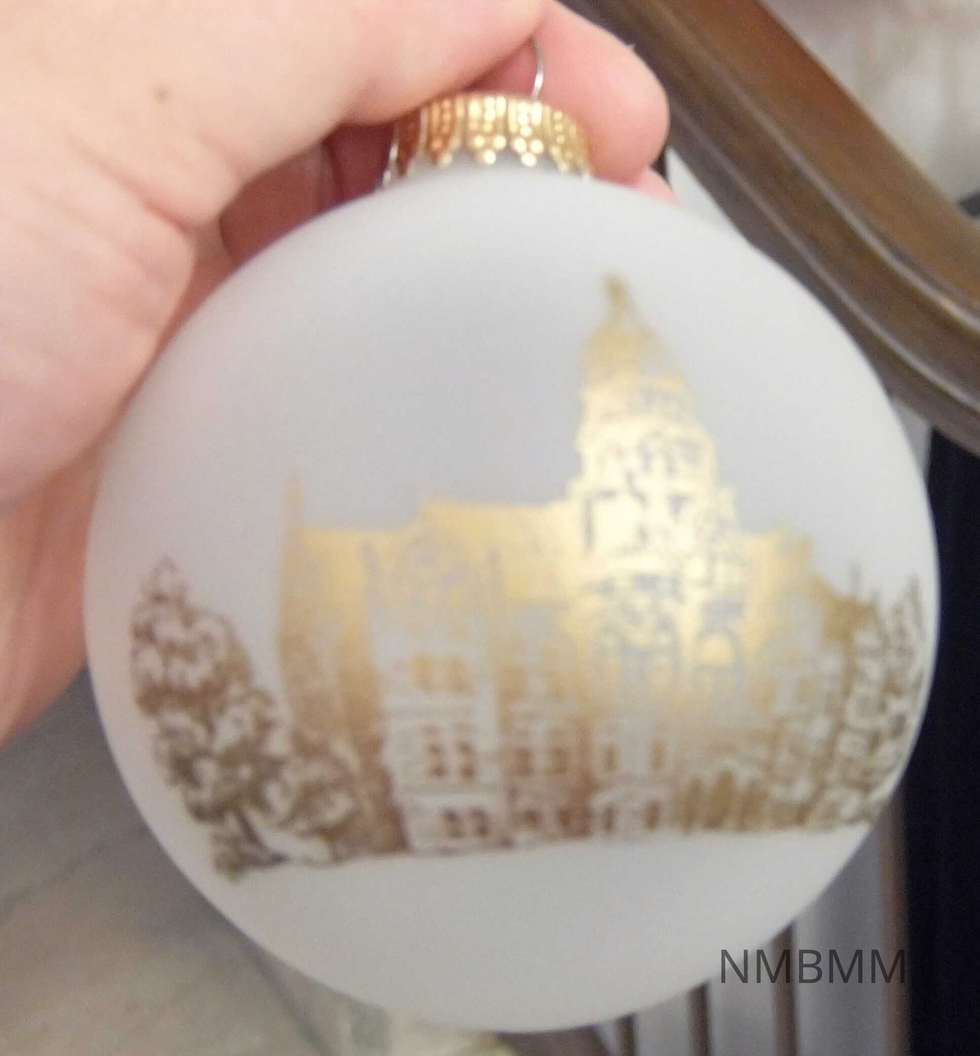 Milky white glass bulb with gold lettering and artwork. The front of the bulb shows an image of the Trumbull County Courthouse in Warren, Ohio. The image is in gold and is silk screened. The back of the bulb reads "Warren, Ohio Bicentennial Celebration 1799-1999 Trumbull County Courthouse" in gold with gold scrollwork surrounding the text. The ornament has a gold crown hanging loop with a gold cord attached.