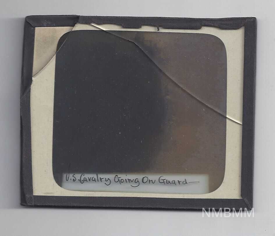 This is a negative glass slide that shows soldiers going on guard in Canton, Ohio. Although there is no actual date listed, this appears to be around the time of the funeral of President McKinley in 1901. There is text on the slide that reads "U.S. Cavalry Going On Guard." The slide is cracked and missing a piece of glass in the upper left corner.Collection