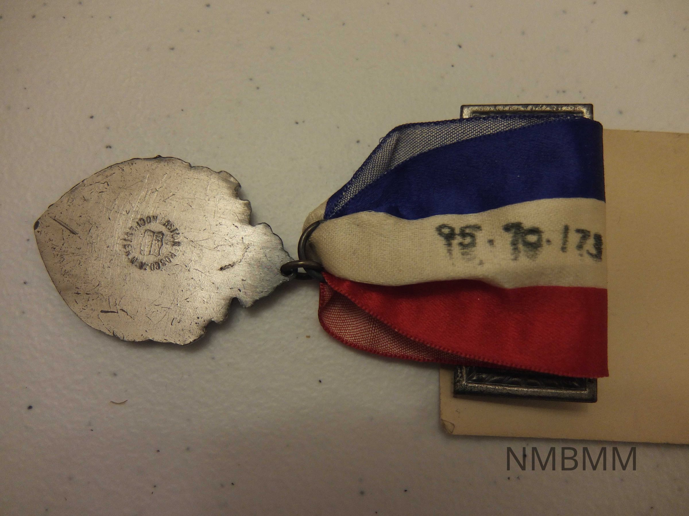 This is a plastic, metal, cloth and paper encampment badge. At the top of the badge is a silver metal name tag holder. Inside the tag, the words "G. A. R. are printed on ivory paper with a plastic covering. Attached is a red, white and navy blue vertical striped ribbon with words in silver that read "61st Annual Encampment. G. A. R. of Ohio. Canton. June 12-16, 1927." Hanging from the ribbon by a metal chain link is a silver medal with a picture of the McKinley Monument in Canton, Ohio etched into the metal. The medal is shaped like a pear or teardrop. The words "McKinley Monument" are inscribed above and "Canton, Ohio" below. The badge is pinned to a 2 1/4 inch x 5 1/2 inch piece of cardboard. On the front bottom part of the cardboard is the name of the manufacturer, "Bastian Bros. Co., Rochester , N. Y. Along side of the union label printed below these words is the number 19. "Badges, Buttons, Metal and Celluloid Novelties, Gold and Silver Emblems" is written below the label. The reverse side of the ribbon has an old accession #, 95.70.173 . On the back of the medal, the words "Bastian Bros. Co. Rochester N. Y." are the only words that can be clearly read, although there are other illegible markings. The back of the cardboard also has the same old accession # and a partially visible name and address of Mr. George Bechtel.Collection