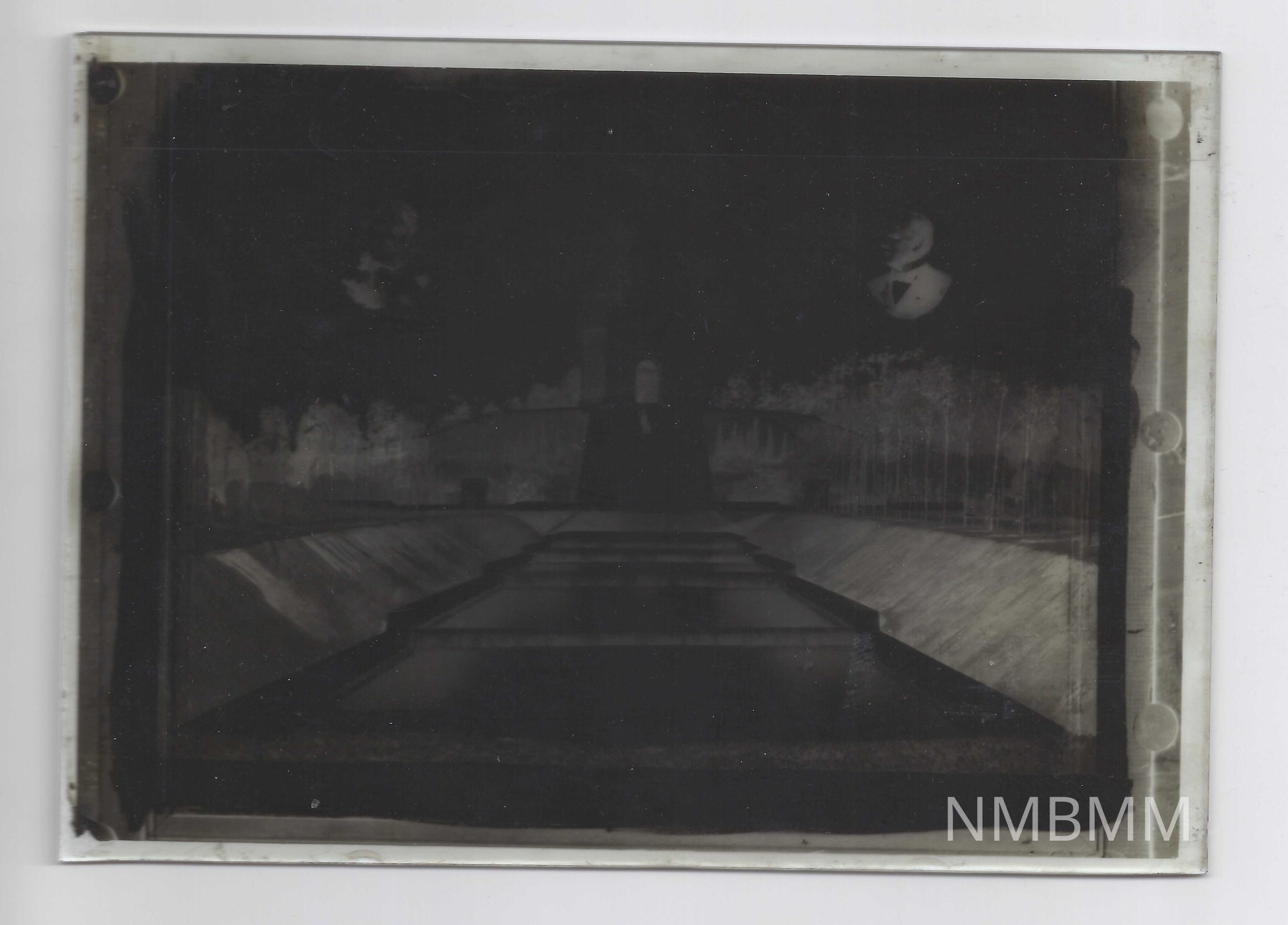 This is a negative glass slide that shows the image of the McKinley National Memorial in Canton, Ohio, with photos of Ida McKinley and President McKinley on the image. The envelope it is in has text that reads "Glass Photographic Plate. McKinley Monument & Wm. & Ida Pictures. Copyright 1907. Style 2. From Clara Weiss Collection."Collection