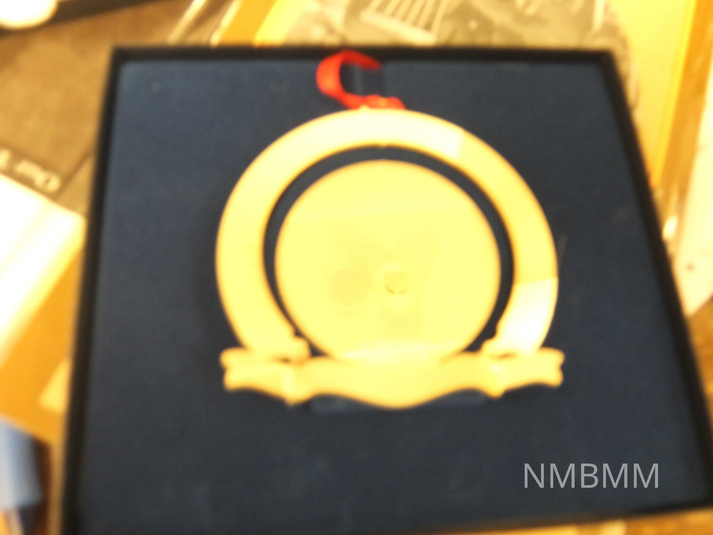 This ornament is part of the White House Historical Association's series of collectible ornaments. It is the ninth in the series. The ornament "celebrates the 200th anniversary of Presidency of the United States in a replica of the official seal of the President." The original ornament was on the tree has in the Blue Room of the White House during the 1989 Christmas season. A red satin ribbon for hanging the ornament is attached. The ornament includes an informational insert telling about the ornament and the White House Historical Association. The ornament is in a navy blue box with a blue velveteen liner. The lid of the box has an image of the Presidential Seal in gold along with the words "White House Historical Association Presidential Bicentennial Edition" in the center of the lid. the bottom of the box is plain blue, with a small white bar code sticker near the bottom and the words "Visit www.whitehousehistory.org" in white under the sticker.