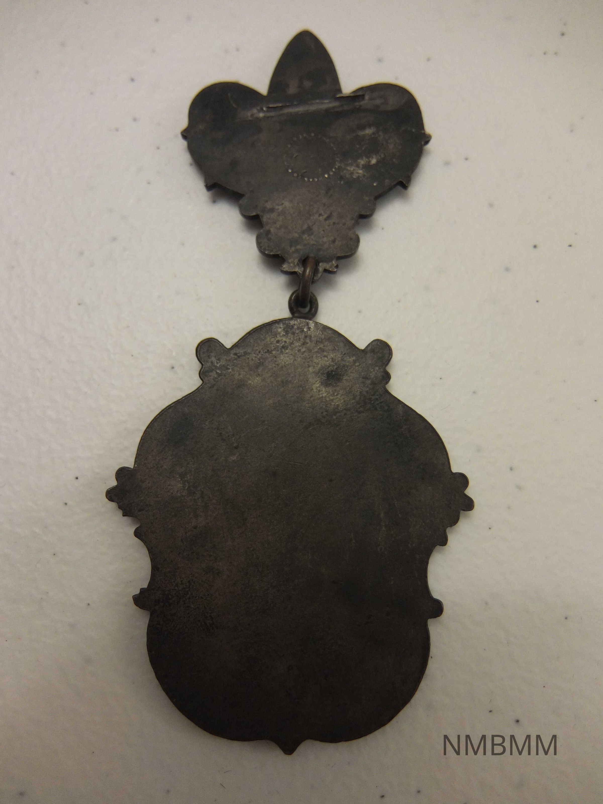 This is a two part commemorative medallion of the McKinley Monument. The top part of this silver medallion is a fleur de lis design, with a picture of McKinley in the center and his name "Wm McKinley" below. Above his picture is a wreath of laurel leaves. On either side are fronds etched into the metal and words reading "Oct" on the left and "16th" on the right with some scroll work at the bottom. Suspended from the fleur de lis, by a single chain link, is the second part of the medallion. The top is arched with a banner and words reading "P &, Grand Lodge, A. M." The sides have some scroll work and curve slightly inward and the bottom is curved upward with words reading "810 - Canton Ohio - 1907." In the middle is the McKinley Monument, located in Canton, Ohio, with columns on either side holding up two round globes. Above the monument is the "All-seeing-eye" with rays extending out, and a compass and square with the letter "G" in between the two. The reverse side of the medallion has a pin for attaching and is otherwise plain with no visible markings of identification.Collection