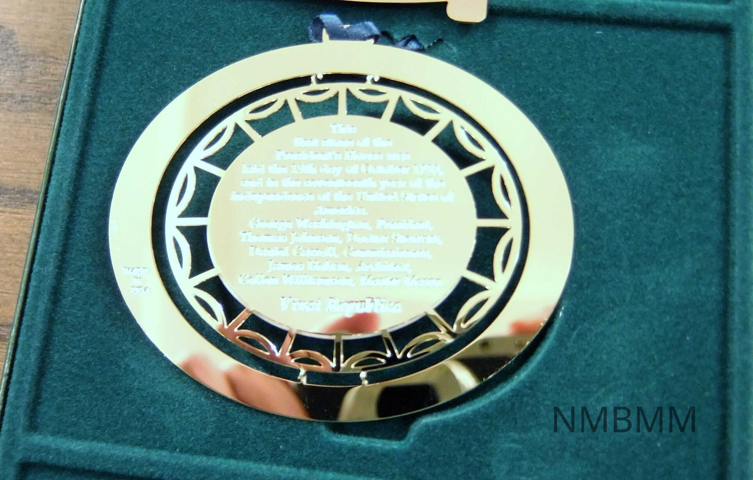This ornament is part of the White House Historical Association's series of collectible ornaments. It is the twelfth in the series. The ornament commemorates the bicentennial of the White House. The original ornament was on the tree in the Blue Room of the White House during the 1992 Christmas season. A blue satin ribbon for hanging the ornament is attached.